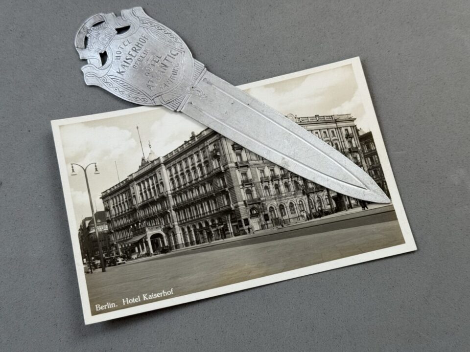 Aluminum letter opener, 16 cm long, reading at the top ‘Hotel Kaiserhof Berlin Hotel Atlantic Hamburg’. Slightly damaged at the bottom from use, else very good. […]