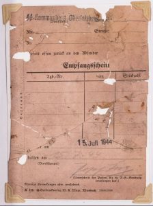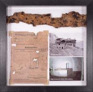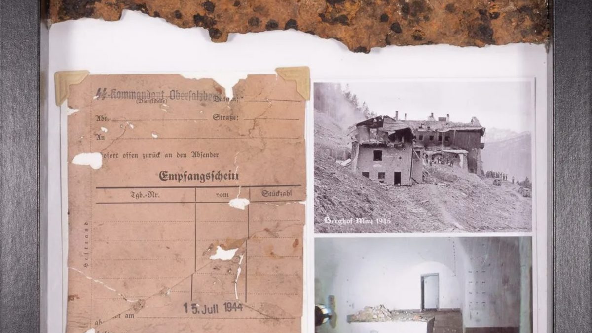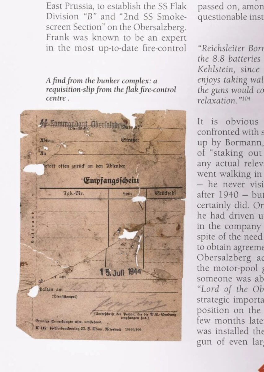Two historical relics recovered by a local resident from Adolf Hitler’s mountain retreat the Berghof at Obersalzberg.The first is a recovered piece of shrapnel from a bomb that destroyed Hitler’s Berghof at the end of the war, the second relic is a document from the SS-Commander Obersalzberg found inside the ‘command tunnel’ of Martin Bormann’s bunker at Obersalzberg. The document ‘Empfangsschein’ [Receipt] was found during the filming of a documentary about the bunker of Reichsleiter Martin Bormann on the Obersalzberg. It was found in the ‘Command – Tunnel’ which was part of Bormann’s bunker and housed the Obersalzberg command center.’ The document recovered in Bormann’s bunker is a receipt or ‘Empfangsschein’ stamped at the top ‘SS-Kommandant, Obersalzberg 15. Juli 1944’, it is signed in pencil at the bottom and dated 15.7.44. This document and other items are illustrated in the book ‘Inside Hitler’s Mountain – The book is a fascinating work about the history of the Obersalzberg.