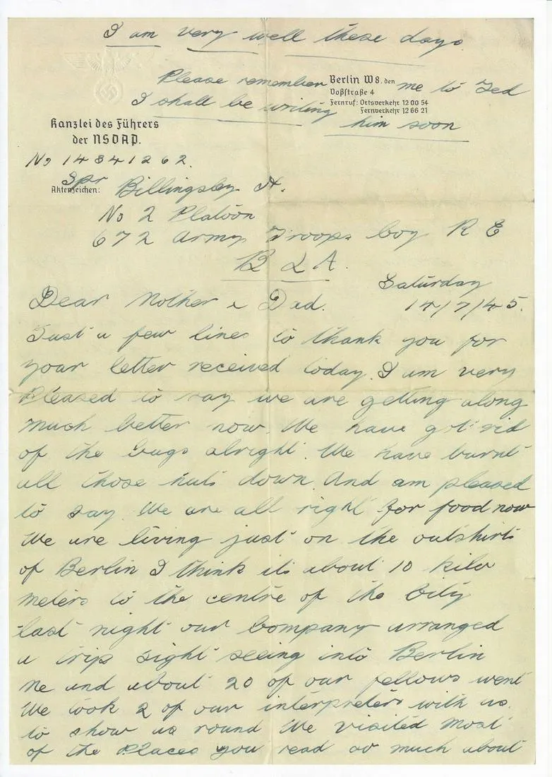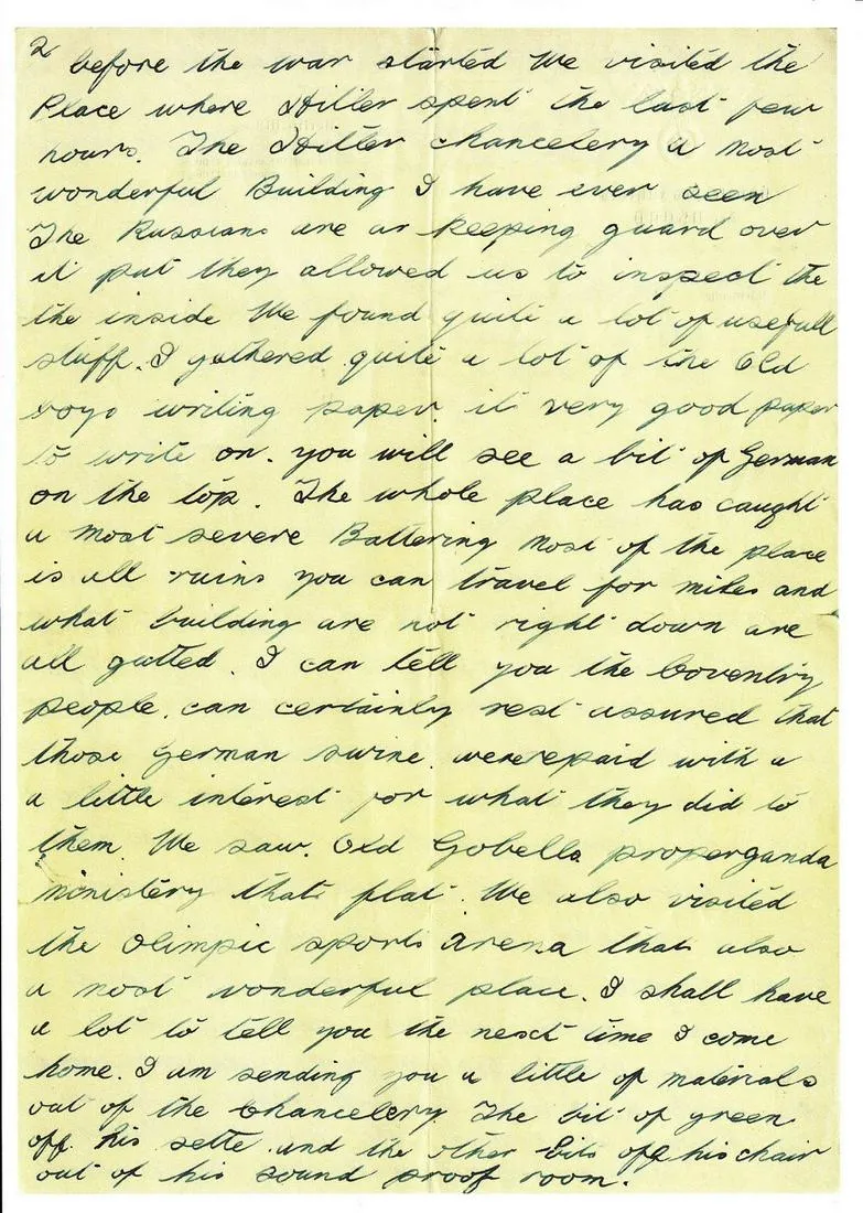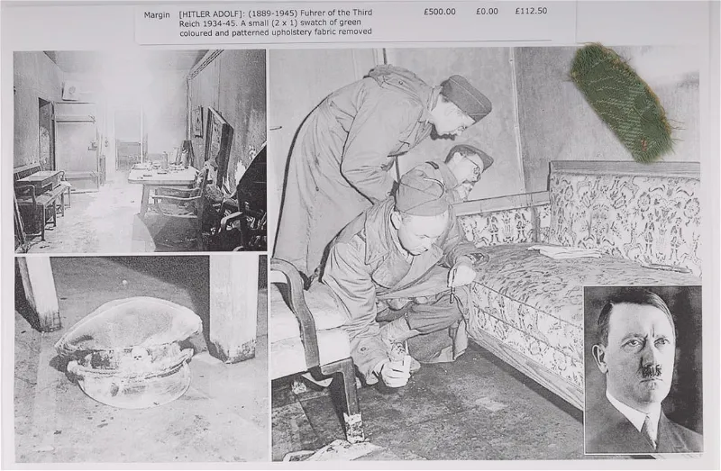 An interesting rare relic pieces approximately 5,5 X 2 cm remouved from the ‘soundproof room’ in Hitler’s bunker. A piece swatches of gold and green coloured and patterned upholstery fabric removed from the chair in Adolf Hitler’s Fuhrerbunker. Thes piece were recovered by a British soldier only identified as ‘Billingsby’ of No. 2 Platoon, 672 Army Troops. Accompanying this lot is a photocopy of a letter he sent home to his parents at the time of his find, dated July 14, 1945, which he wrote on Hitler’s own letterhead. In part: ‘…We are living just on the outskirts of Berlin…Last night our company arranged a trip sight seeing into Berlin…The…Chancellery a most wonderful building I have ever seen. The Russians are out keeping guard over it but they allowed us to inspect the inside…We found quite a lot of useful stuff. I gathered quite a lot of the old boys writing paper, it is very good paper…I am sending you a little of materials out of the Chancellery. The bit of green off his settee and the other bit off his chair out of his sound proof room…’ Along with the letter are two photocopies of the aforementioned settee and chair.