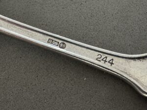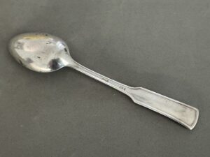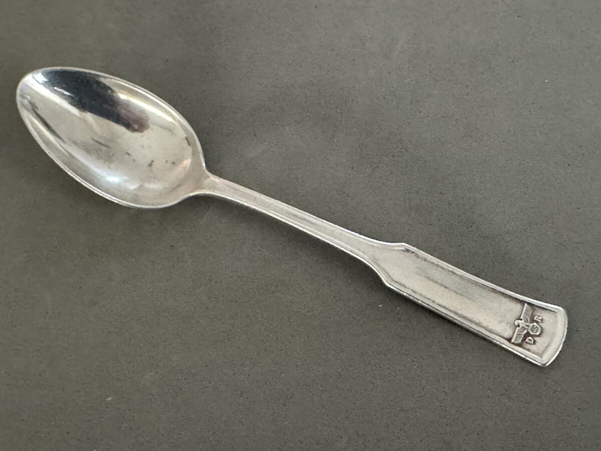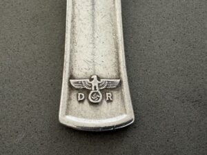 SOLD,SOLD,SOLD This Table Spoon measures 14,5 cm long. The bowl of the spoon remains in fine condition.The handle has a raised edge and is marked with a raised Deutsche Reichsbahn eagle and swastika. The initials of the organization, “D” and “R”, are stamped to the left and right of the bird respectively. The detailing on the bird remains excellent. The reverse is hallmarked “B” for the Bruckmann firm, a train logo, and “90” which indicates that it is silver plated. It is further stamped “244”, which indicates Hitler’s dining wagon.