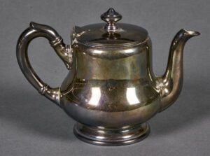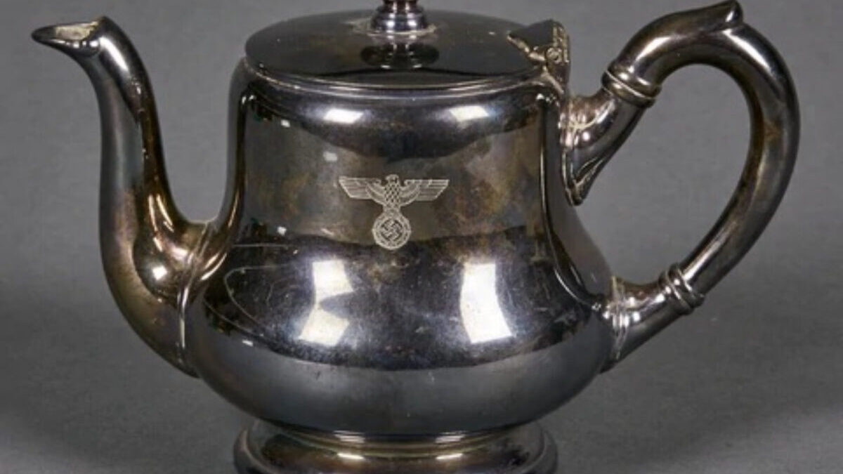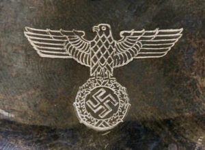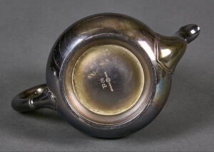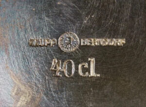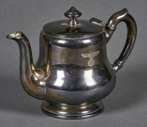 Rare NSDAP Teapot Silver with Political eagle engraved to front. 75cl capacity. Maker marked “Krupp Berndorf”. 14cm in height. Base 94mm. Uncleaned. Some collectors and historians call these the “Bormann Pattern” since this type was also found at Martin Bormann’s house on the Obersalzberg.