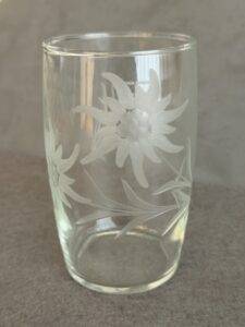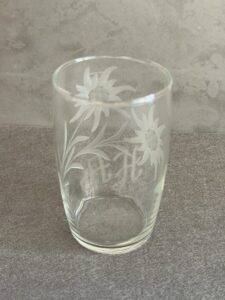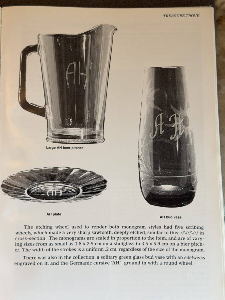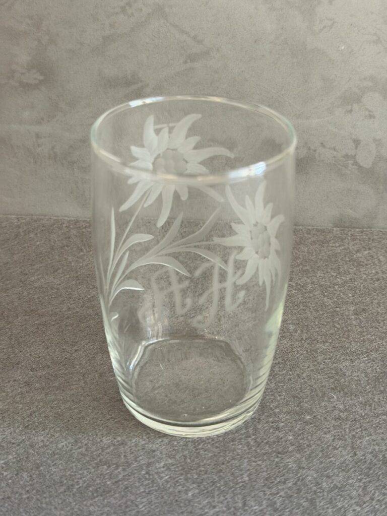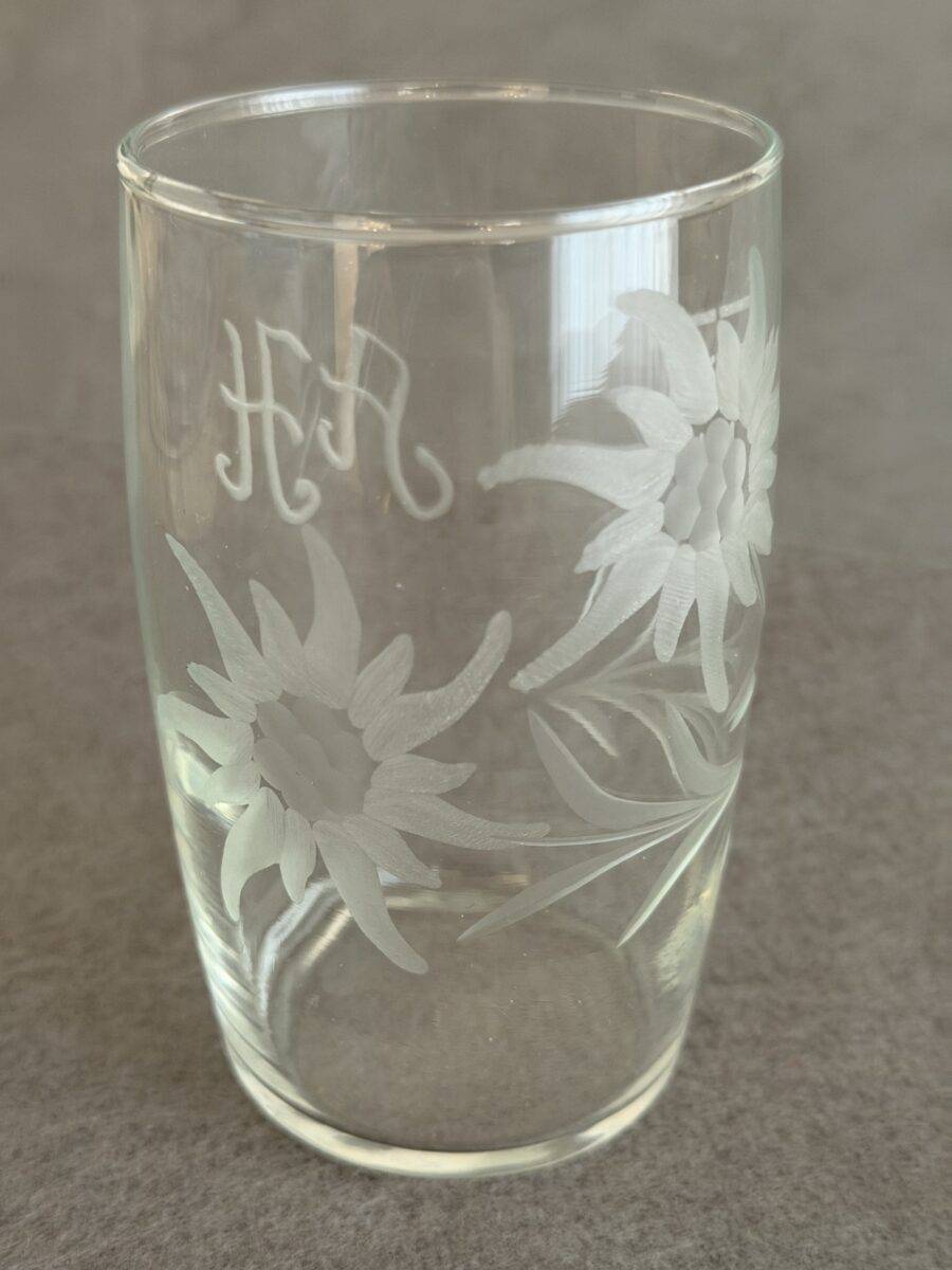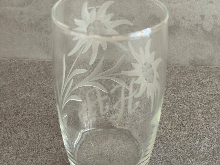 Rare drink glass removed from the Berghof by local residente in April 1945.This drink glass measures 10;5 cm tall high having the special etched AH monogram on the center surface.