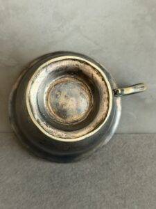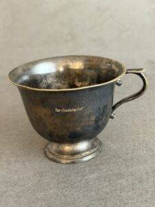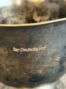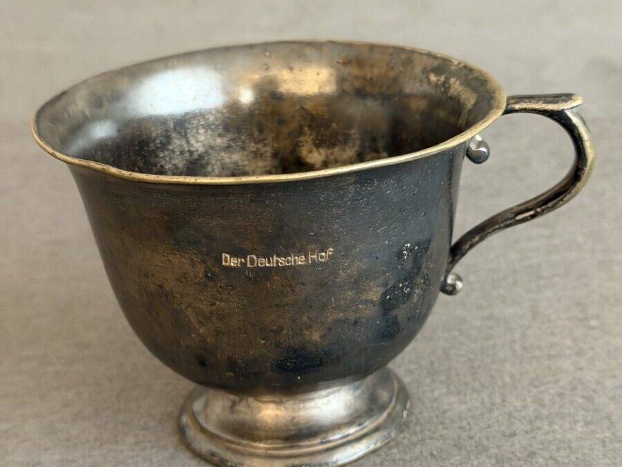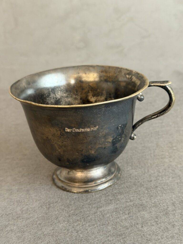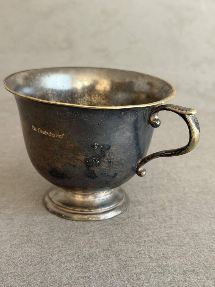 Silver cup from the Deutsche Hof Hotel in Nuremberg. This served as Hitler’s hotel and headquarters for the Nuremberg party rallies and became synonymous with Hitler. Originally named the Hotel Deutscher Hof, it was purchased by the NSDAP in 1935 and renamed Der Deutsche Hof. It underwent renovations including a balcony to allow Hitler to review parades. Included in the renovation was the new design of the silver service. The hotel was closed in 2008 but is still in existence.