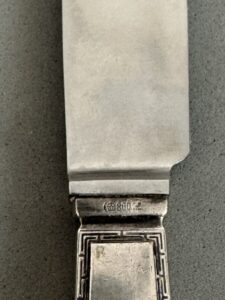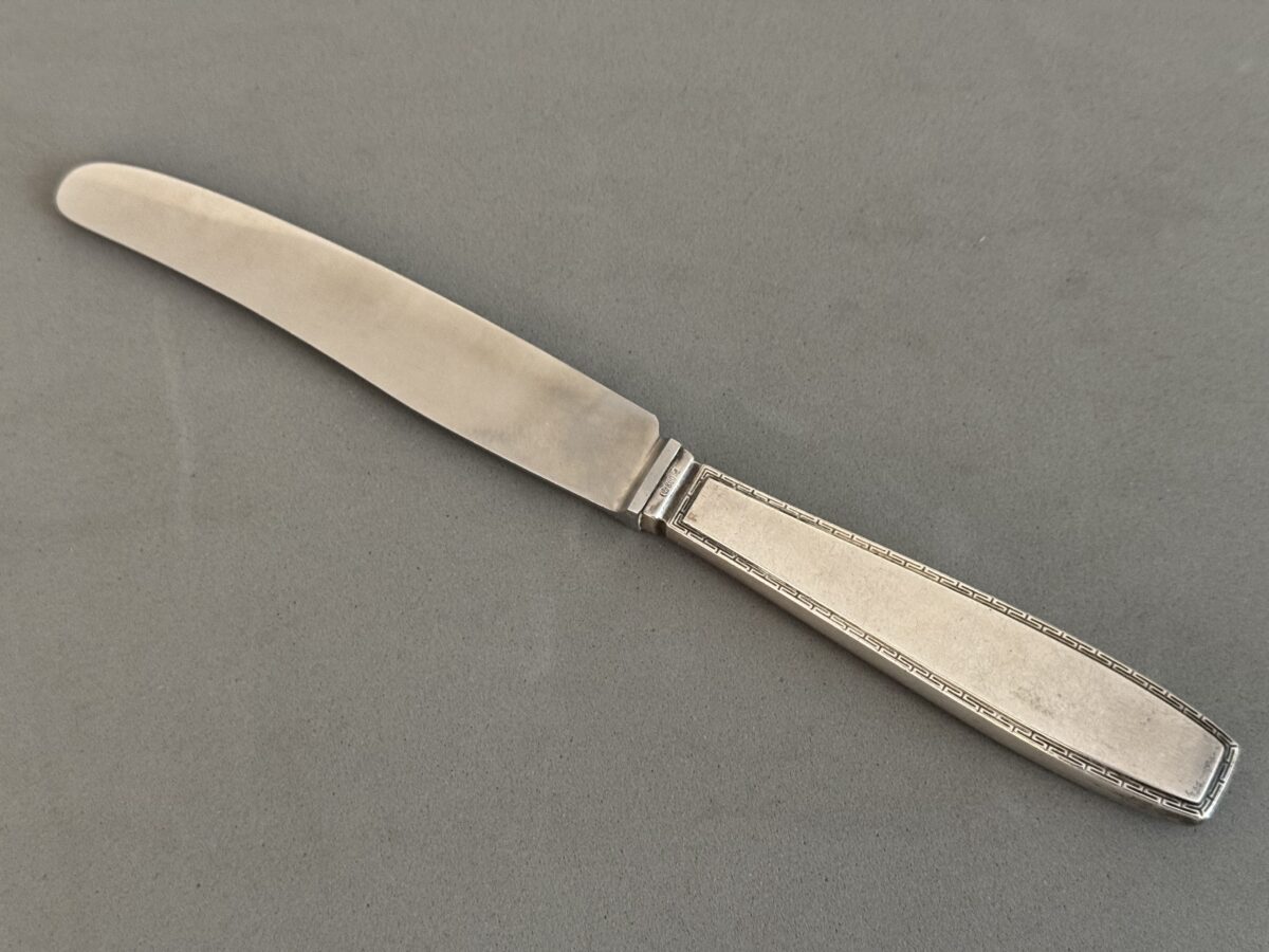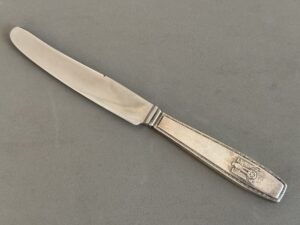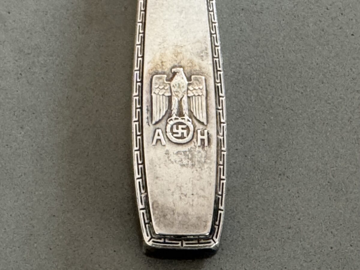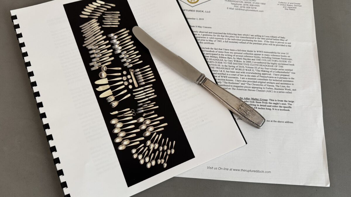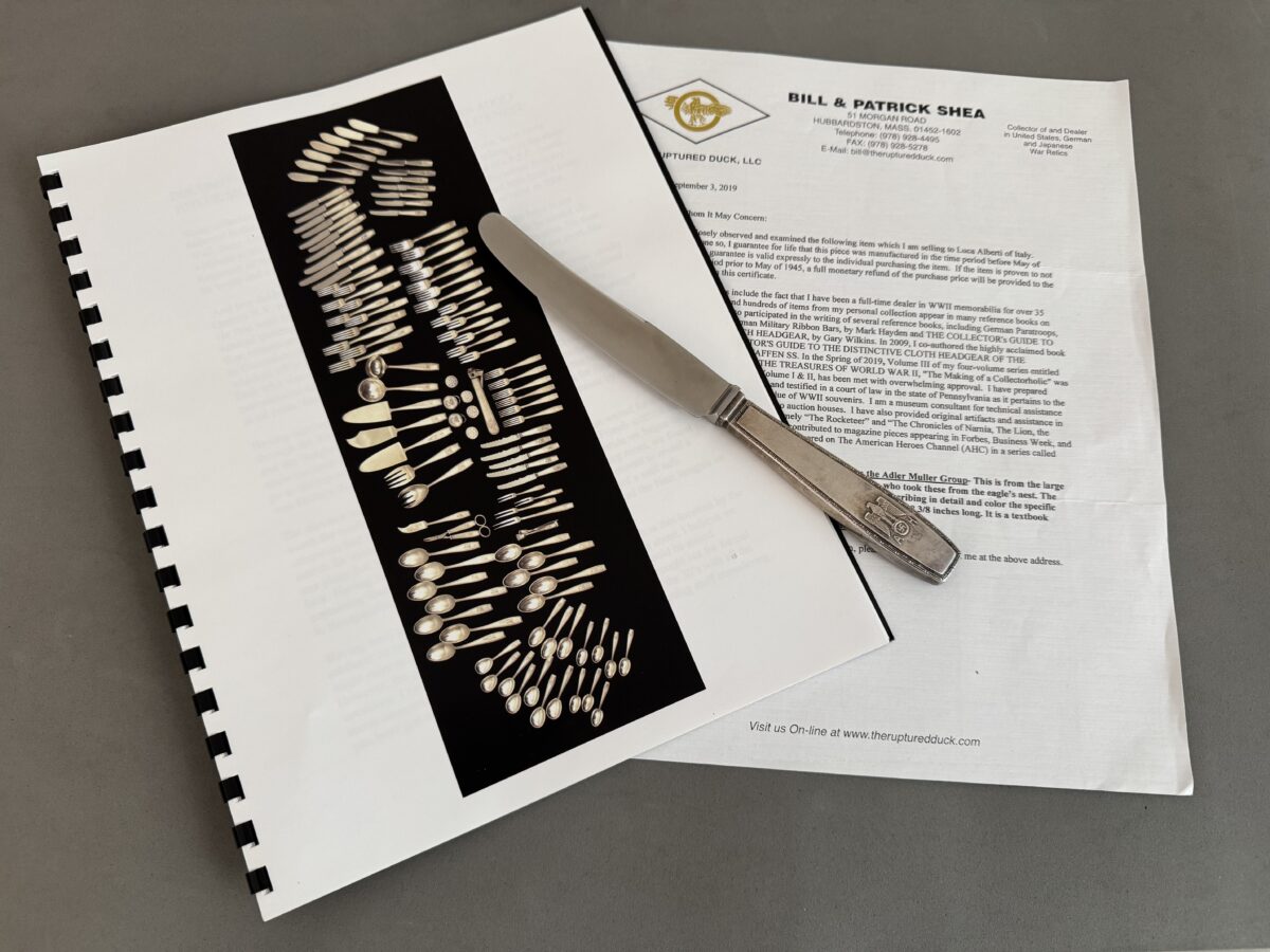 SOLD,SOLD,SOLD This piece comes from an amazing silver hoard that was sold by Bill Shea of Ruptured Duck Militaria. A superb original piece of silverware taken from Hitler’s Eagles Nest by a C Company soldier of the 101st Airborne Division in May 1945. It is a ‘Führer pattern’ lunch knife. Collectors nowadays commonly refer to this Bruckmann pattern as the formal pattern.