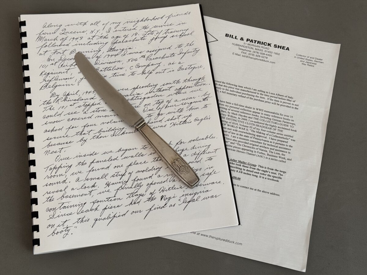 Some collectors say “don’t buy the story, buy the item!”. Well I, for one, have never believed in that philosophy. I guess a lot of that depends on who is telling you the story. These details are directly from the mouth and the written word of a P.F.C. (name withheld at his request) from Charlie Company, 2nd Battalion, 506 Parachute Infantry Regiment of the 101st Airborne Division. These details were gathered both from a letter he wrote and a face to face conversation he had with a good friend of mine in 2006. And boy did he have a story to tell. He related that he, like most of the boys in his Queens, N.Y. neighbourhood, entered the service in March of 1943 when he turned 18. He first went to the Armour Corps at Fort Polk as part of the 8th Armour Division. He then entered training with the Army Air Corps as a pilot, but this program was cut short. He then volunteered for the Paratroopers and trained at Fort Benning in Georgia. In December of 1944, he was assigned to the 101st Division in France. They were quickly whisked off to Belgium and attached to the 506th. This is where he encountered Colonel Sink, who was standing on a jeep with a frozen dead German soldier at his feet. He proceeded to tell all these replacements that it was their job to hold the town of Bastogne at all costs. Shortly before Christmas,1944 he was assigned to “C” Company. Having survived that historical event, he then recalled April of 1945 and speeding through the Rhineland to Bavaria without opposition. When they reached Berchtesgaden and the Berghof area, he said they could see this stone structure on the top of a nearby snow-covered mountain. He related how one of the Sergeants asked for four volunteers to go to the top and secure the building. He said “my hand shot up because by then I knew it was Hitler’s Eagles Nest”.