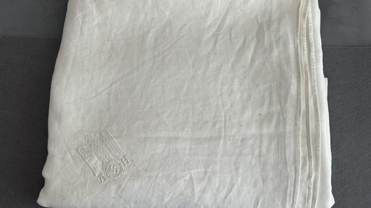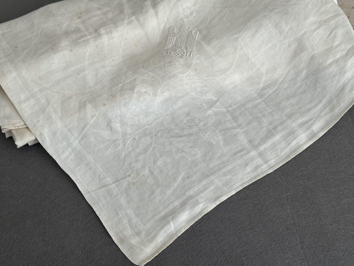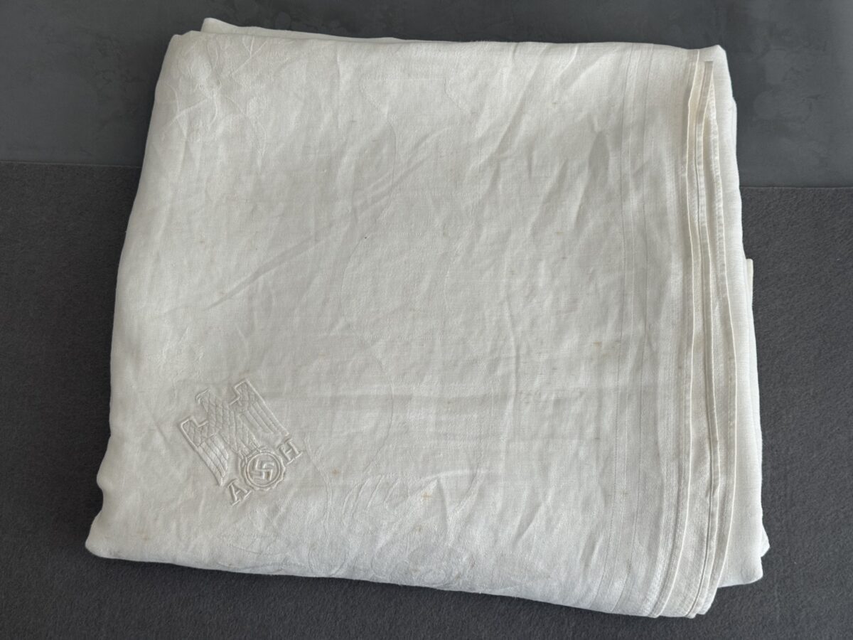 Adolf Hitler’s Personal Large Cloth Formal “A.H.” Monogram Tablecloth removed by local resident in April 1945. A large cotton blend cloth fancy tablecloth with floreal pattern and Adolf Hitler’s personal eagle and AH monogram. This is the type used by Hitler for formal dinners, luncheons and entertaining diplomatic and personal guests. This tablecloth measures 260 x 200 cm. The AH monogram with eagle It is in excellent condition.