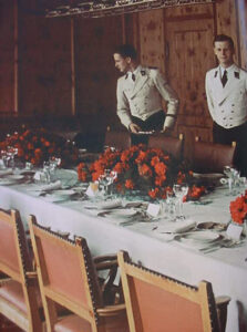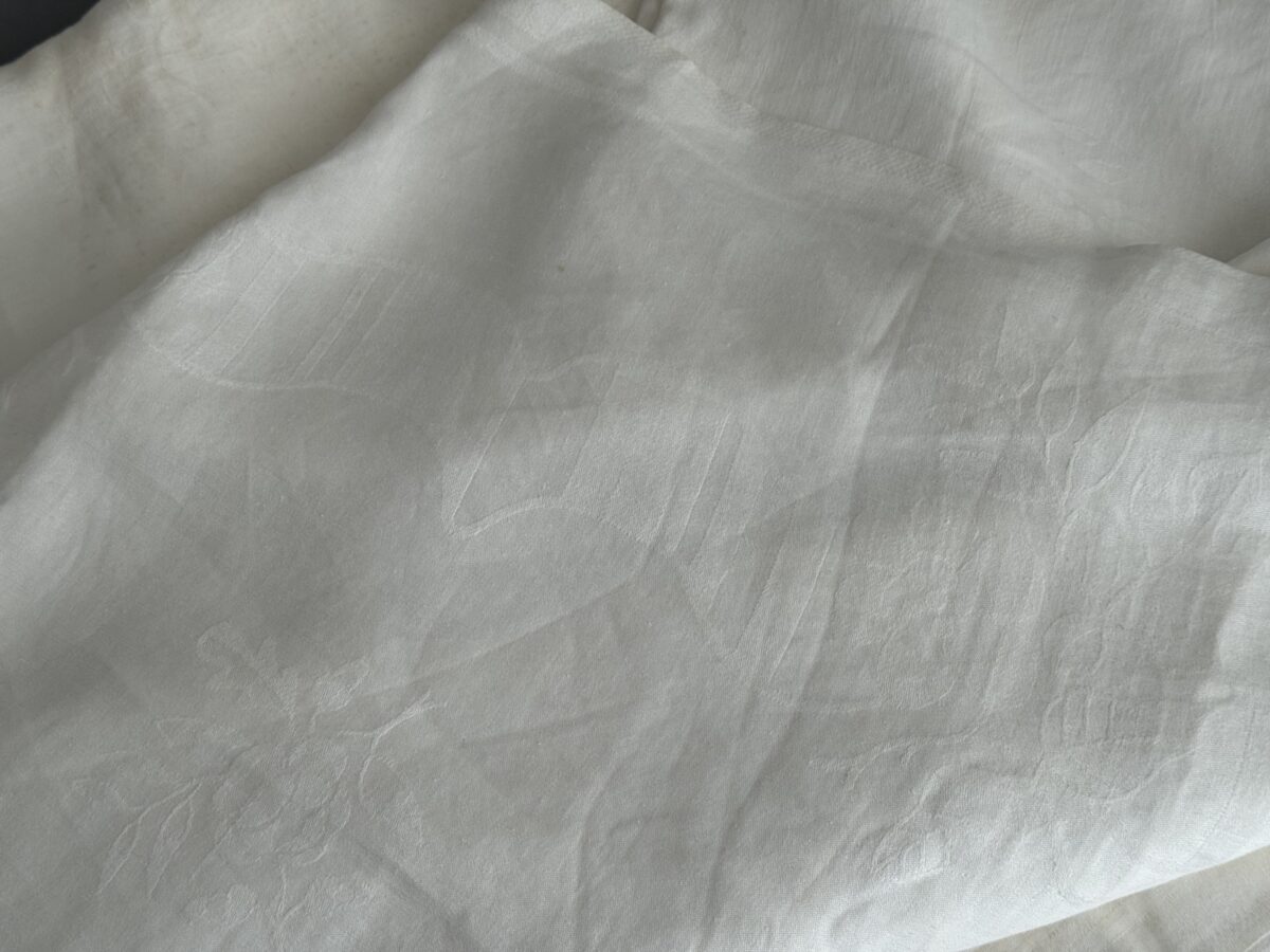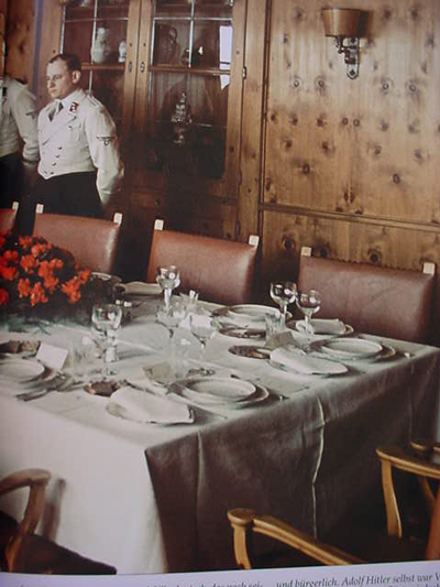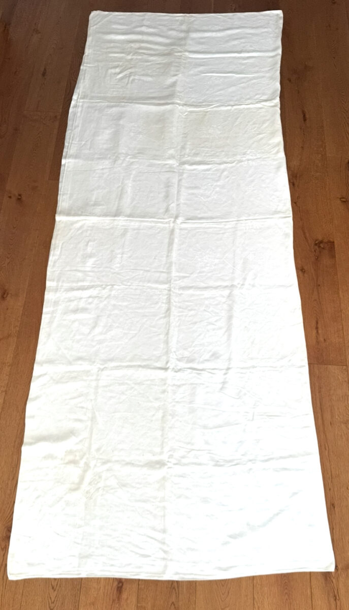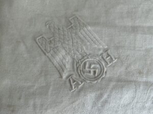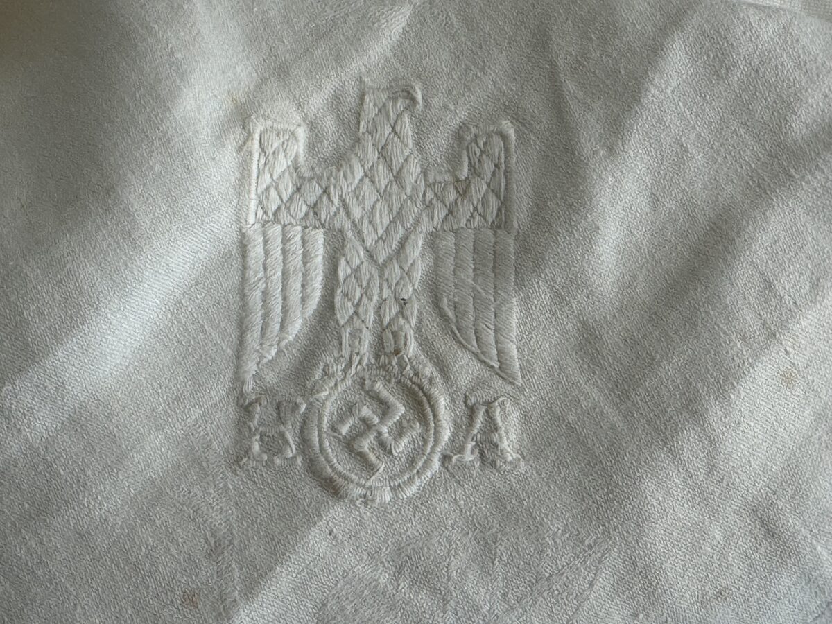 Adolf Hitler’s Personal Large Cloth Formal “A.H.” Monogram Tablecloth removed by local resident in April 1945. A large cotton blend cloth fancy tablecloth with floreal pattern and Adolf Hitler’s personal eagle and AH monogram. This is the type used by Hitler for formal dinners, luncheons and entertaining diplomatic and personal guests. This tablecloth measures 260 x 200 cm. The AH monogram with eagle It is in excellent condition.
