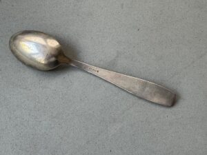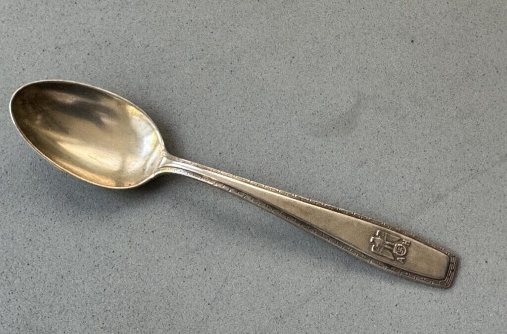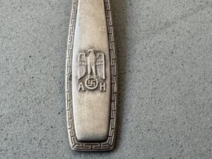 Adolf Hitler demitasse spoon formal pattern which measures approximately 11 cm in length.The spoon a nice patina, the spoon has the traditional Greek Key pattern meandering around the edges of the handle.The lower portion of the handle is adorned with a Political eagle with half-open wings. The eagle clutches an oak wreath with swastika. The initials “A” and “H” on the left and right side of the wreath.