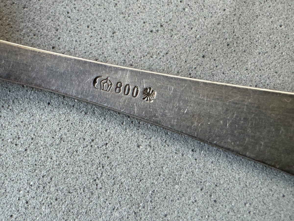 The backside of the handle is hallmarked with the Bruckmann markings, being a crescent, an Imperial crown, “800”.