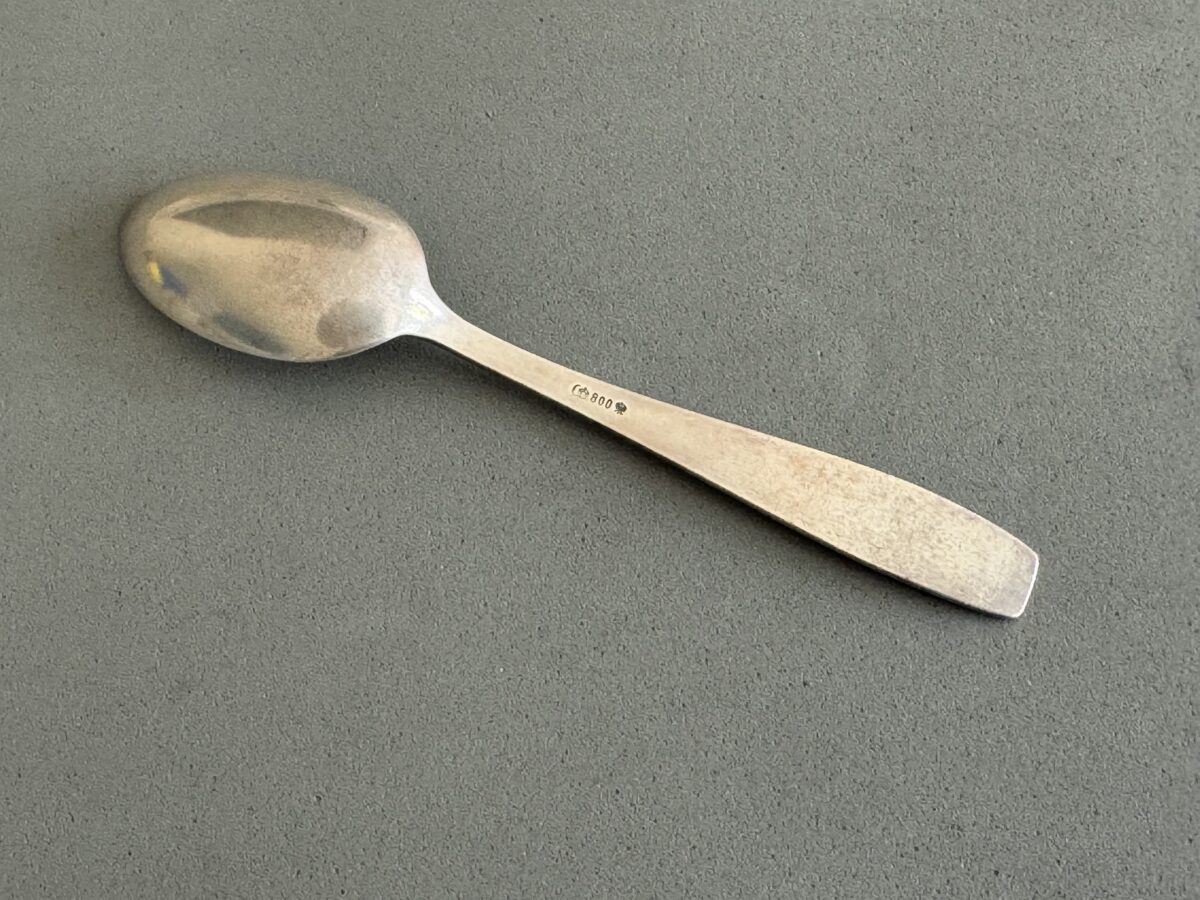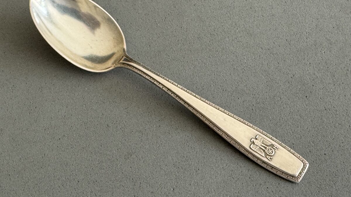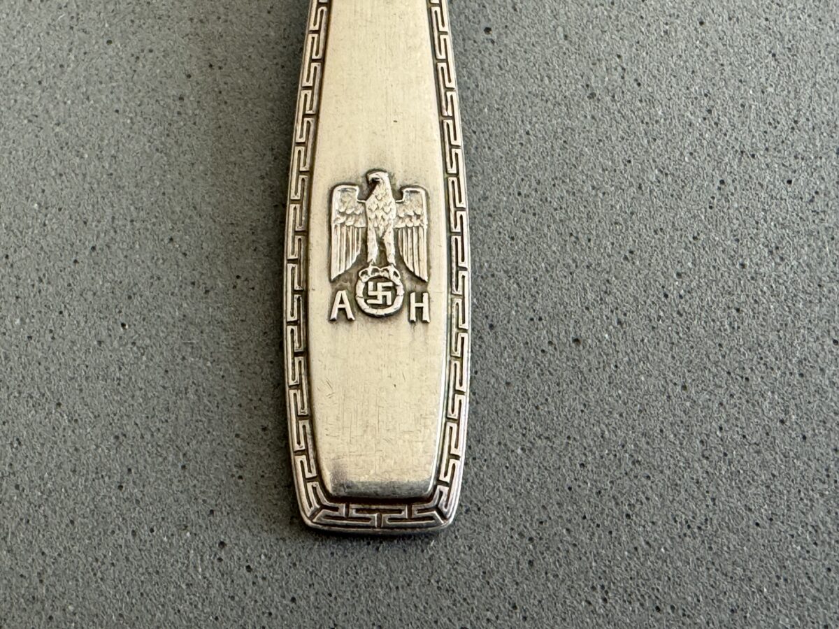 ON HOLD, ON HOLD, ON HOLD Adolf Hitler demitasse spoon formal pattern which measures approximately 11 cm in length.The spoon a nice patina, the spoon has the traditional Greek Key pattern meandering around the edges of the handle.The lower portion of the handle is adorned with a Political eagle with half-open wings. The eagle clutches an oak wreath with swastika. The initials “A” and “H” on the left and right side of the wreath.