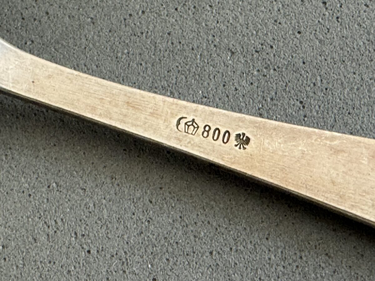 The backside of the handle is hallmarked with the Bruckmann markings, being a crescent, an Imperial crown, “800”.