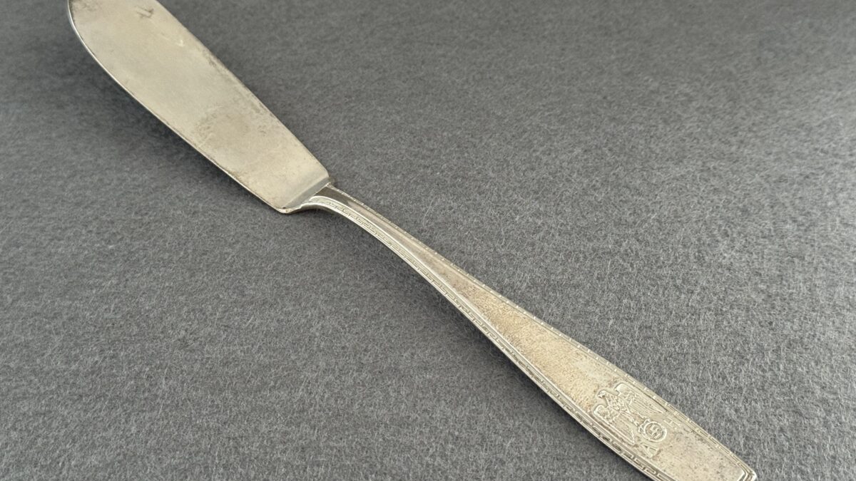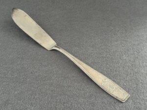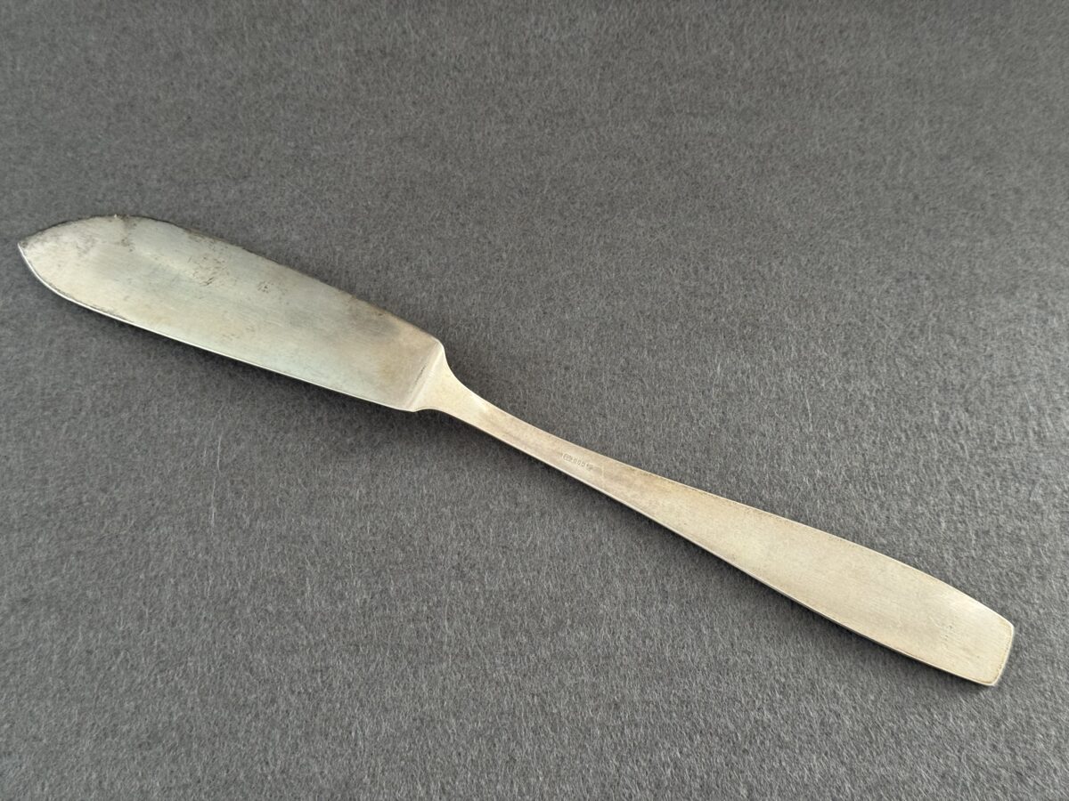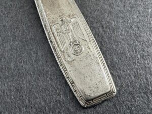 Adolf Hitler fish knife formal pattern which measures approximately 22 cm in length.The knife a nice patina, the knife has the traditional Greek Key pattern meandering around the edges of the handle.The lower portion of the handle is adorned with a Political eagle with half-open wings. The eagle clutches an oak wreath with swastika. The initials “A” and “H” on the left and right side of the wreath.