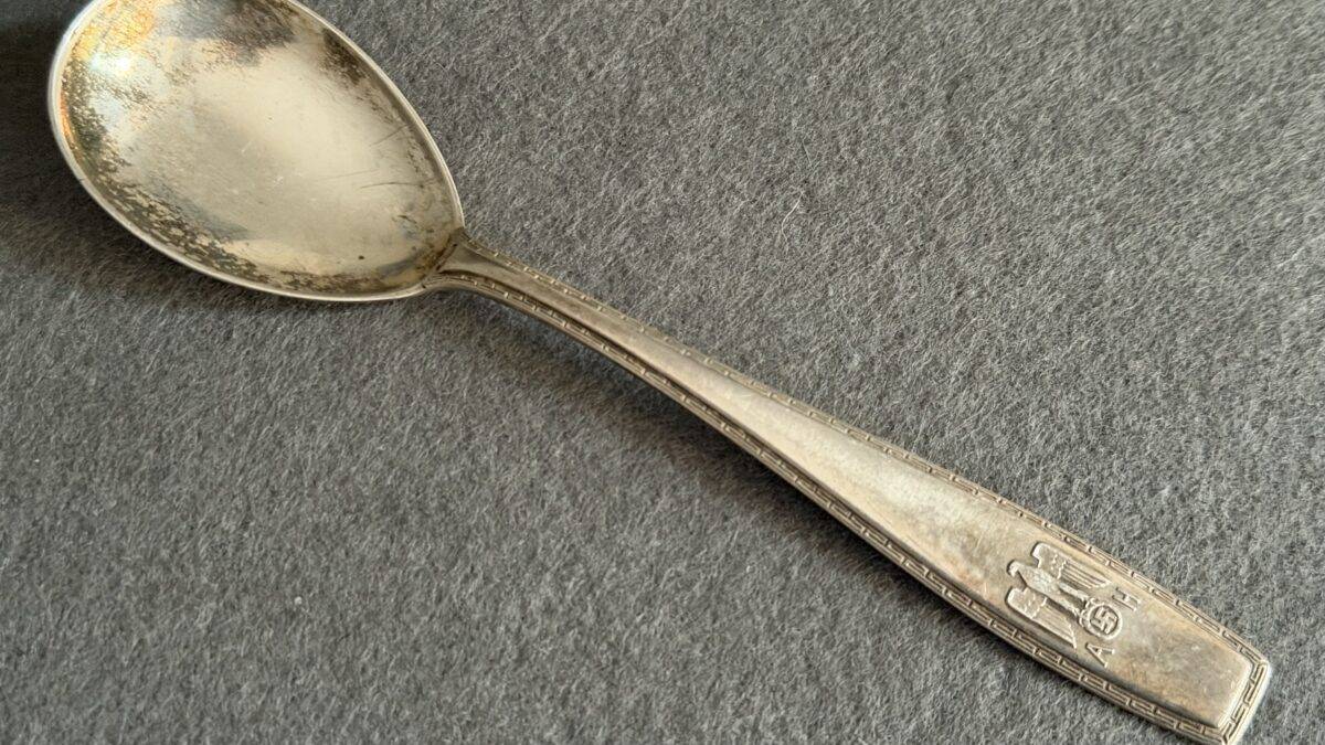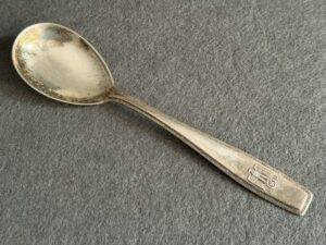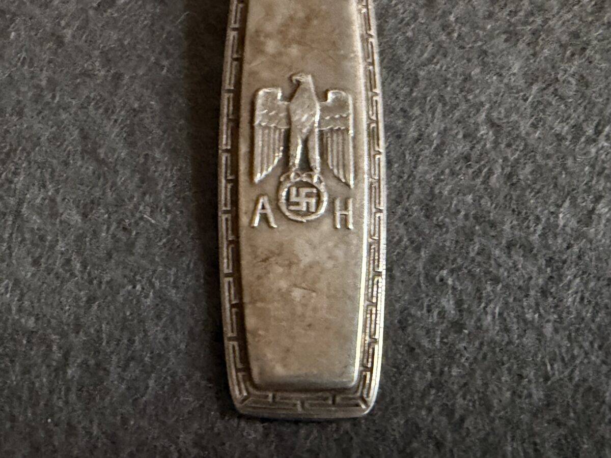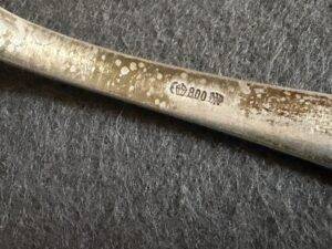 SOLD,SOLD,SOLD This Formal Pattern ice cream spoon in in excellent condition, measuring 14,5 cm long. The rare has the traditional Greek Key pattern meandering around the edges of the front handle. The lower portion of the handle is adorned with a Political eagle with half-open wings. The eagle clutches an oak wreath with swastika. The initials “A” and “H” on the left and right side of the wreath. The reverse of the fork is hallmarked with the Bruckmann markings, being a crescent, an Imperial crown, “800”, and a Prussian eagle.