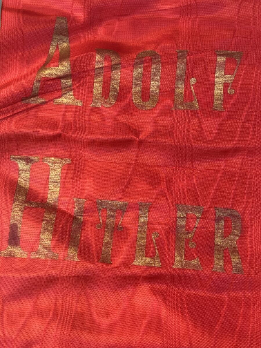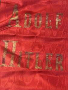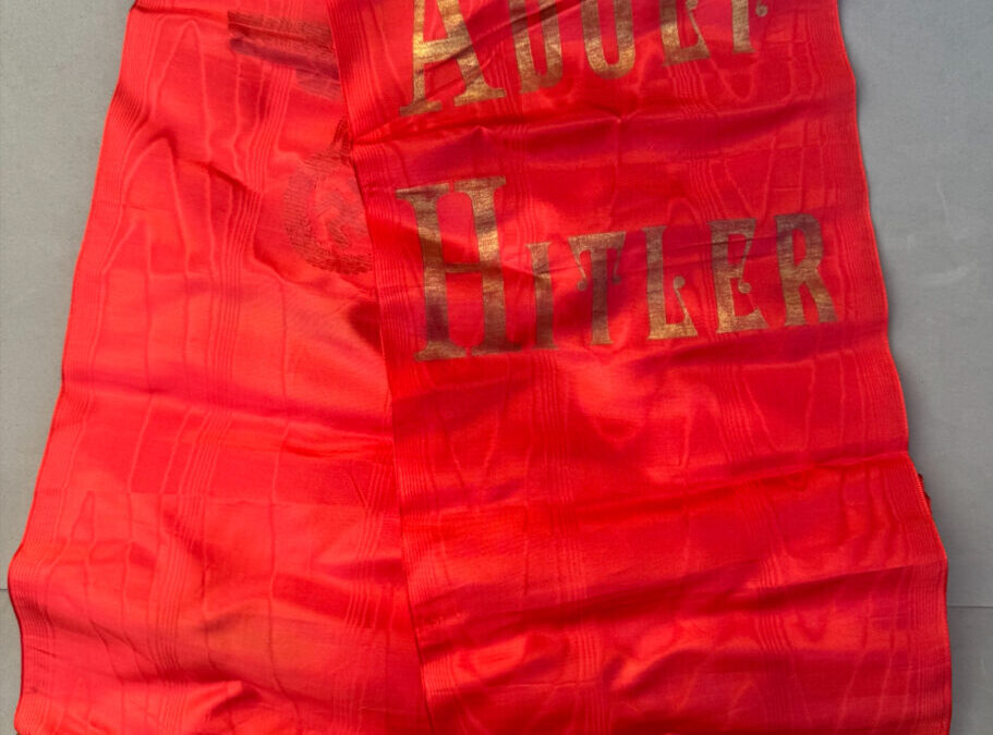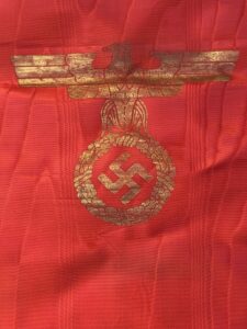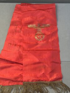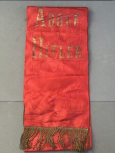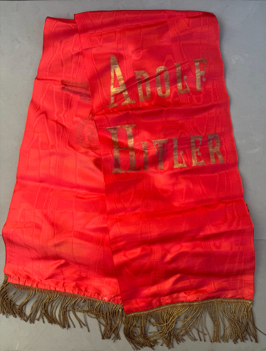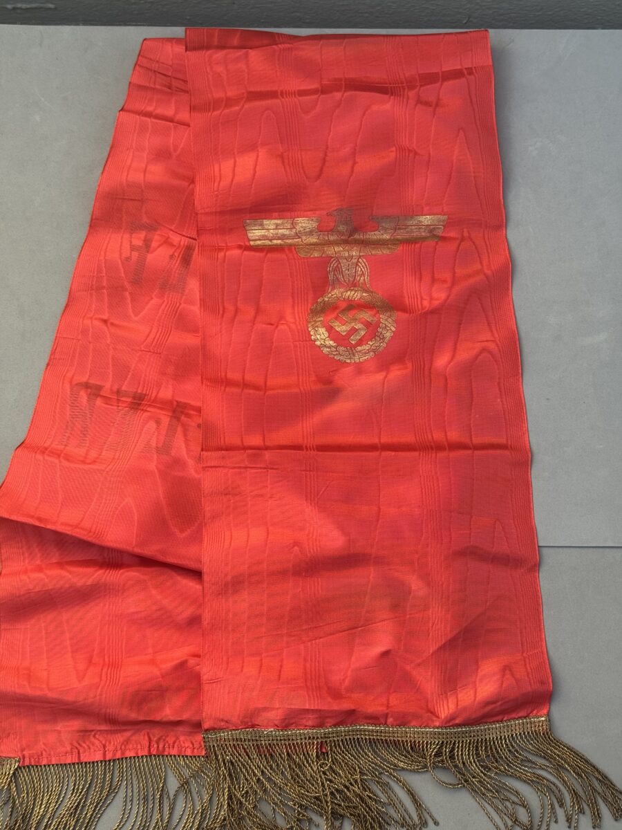 Offered for sale is an Adolph Hitler Funeral Sash. This is the type with the name Adolph Hitler stenciled in gold on one end and the stylized political eagle stenciled in gold on the other end. Condition is excellent and appears unissued and unused. No rips, tears, or splits in the silk. Gold fringe is perfect. measure length 290 cm.