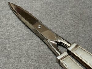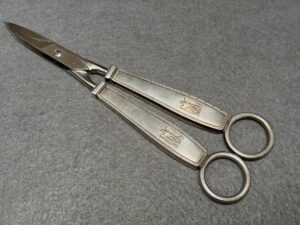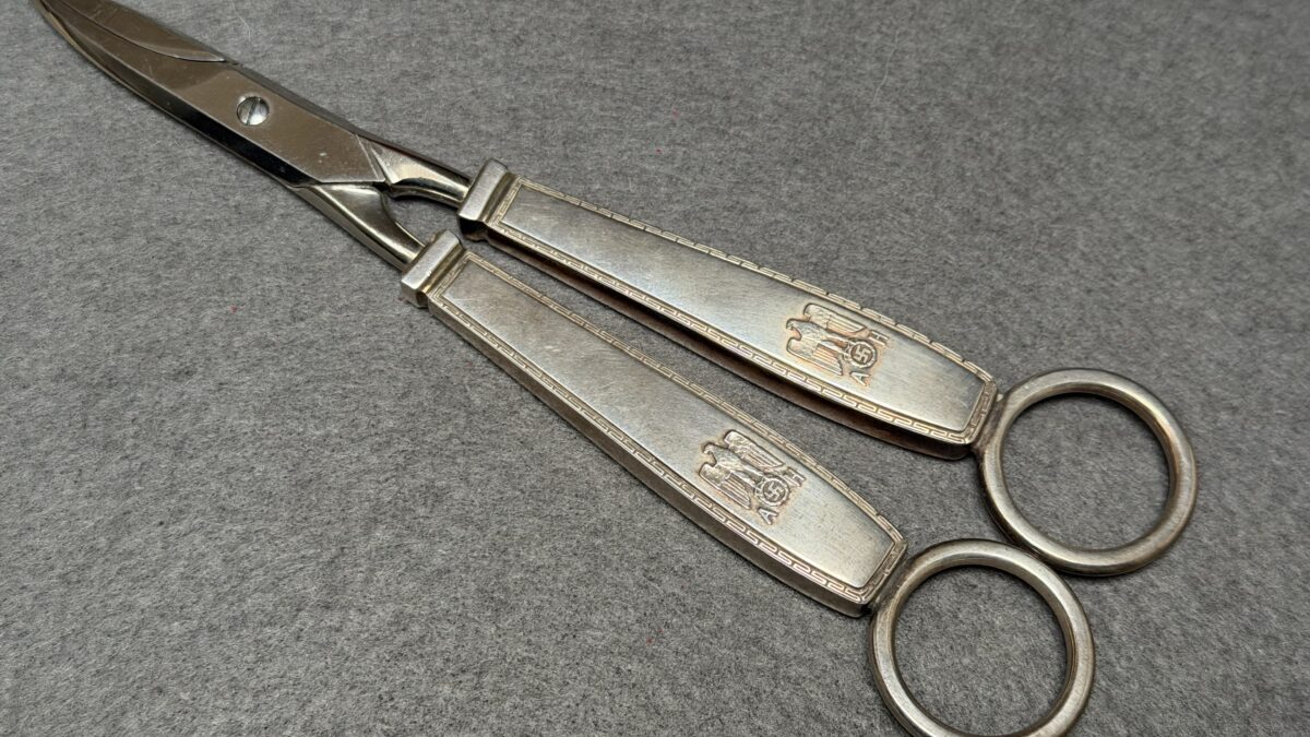 Rare Adolf Hitler’s formal Grape Snips / Scissors that measures approximately 19 cm in length. The Snips handles are stamped with the party eagle along with the “A” and “H”. The rings are hallmarked with the Bruckmann markings, being a crescent, an Imperial crown, “800”, and a Prussian eagle.
