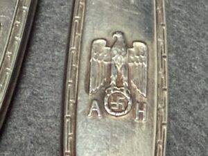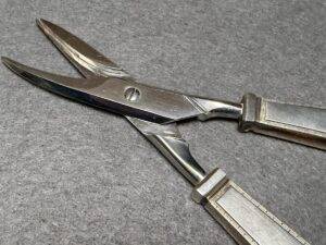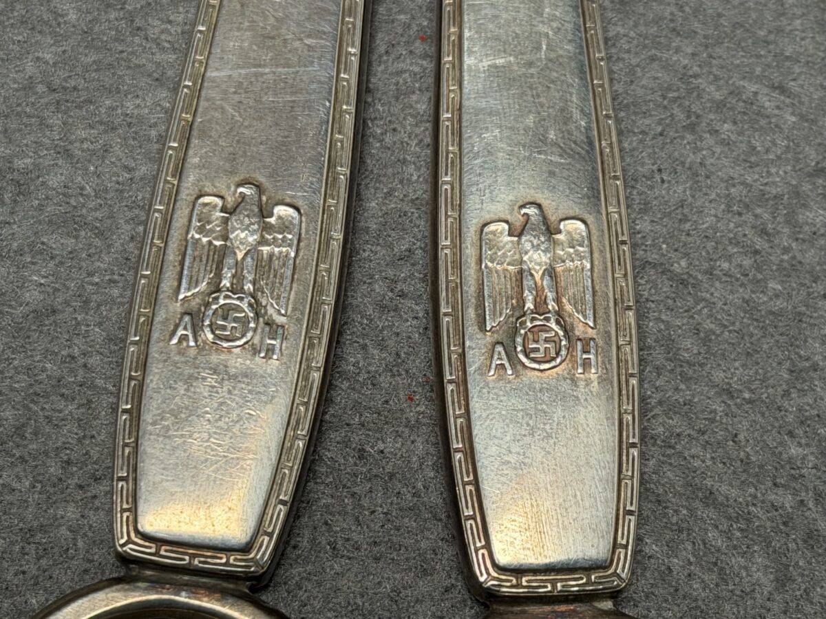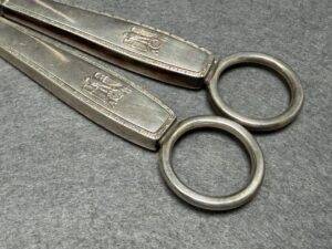Rare Adolf Hitler’s formal Grape Snips / Scissors that measures approximately 19 cm in length. The Snips handles are stamped with the party eagle along with the “A” and “H”. The rings are hallmarked with the Bruckmann markings, being a crescent, an Imperial crown, “800”, and a Prussian eagle.