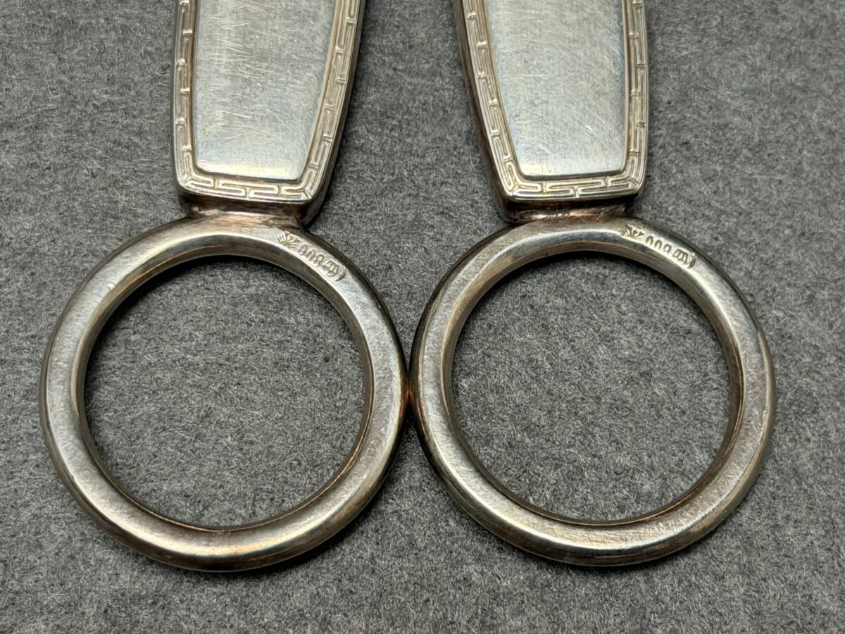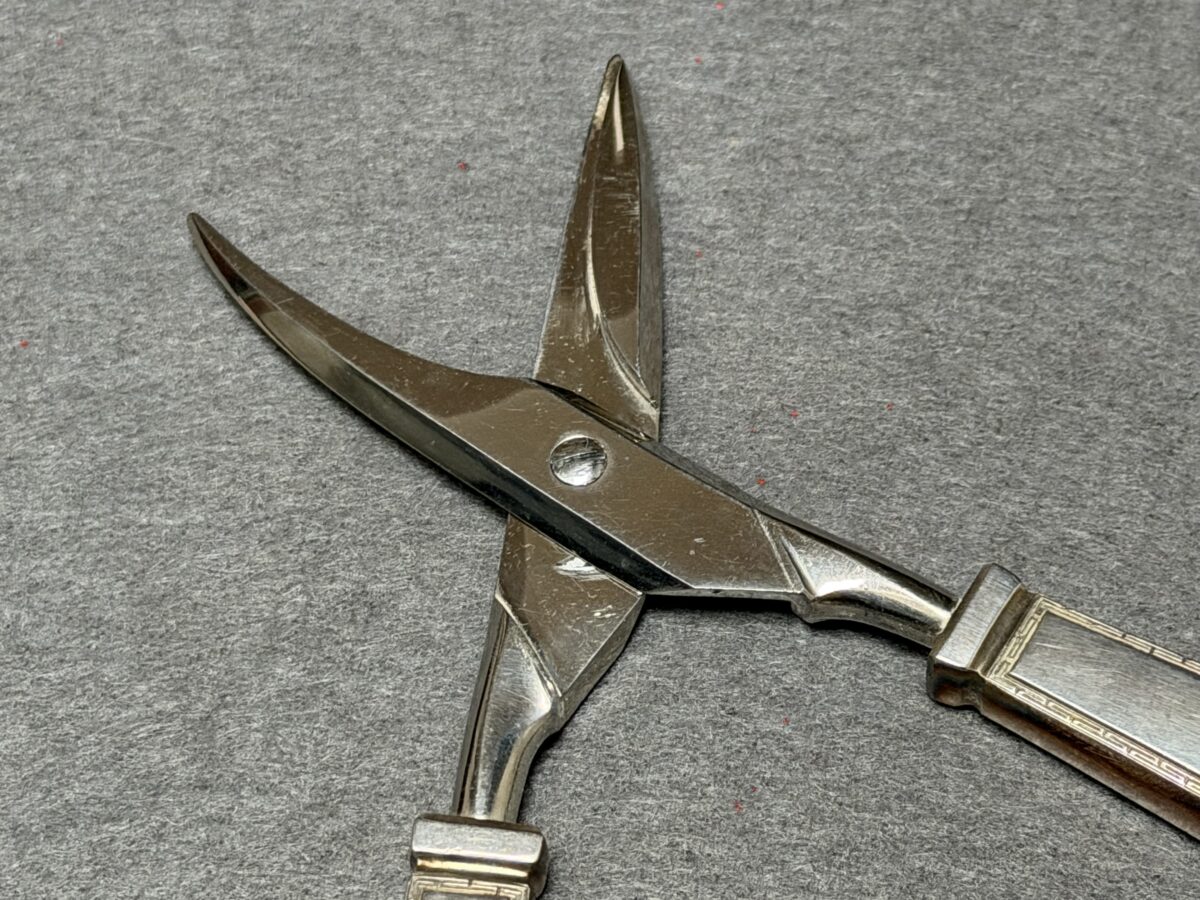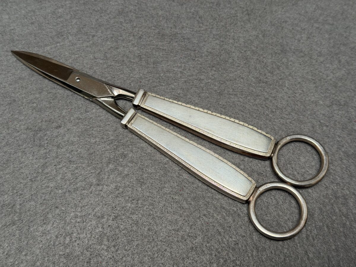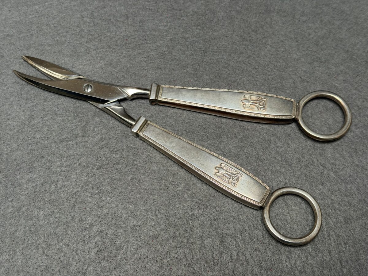Rare Adolf Hitler’s formal Grape Snips / Scissors that measures approximately 19 cm in length. The Snips handles are stamped with the party eagle along with the “A” and “H”. The rings are hallmarked with the Bruckmann markings, being a crescent, an Imperial crown, “800”, and a Prussian eagle.