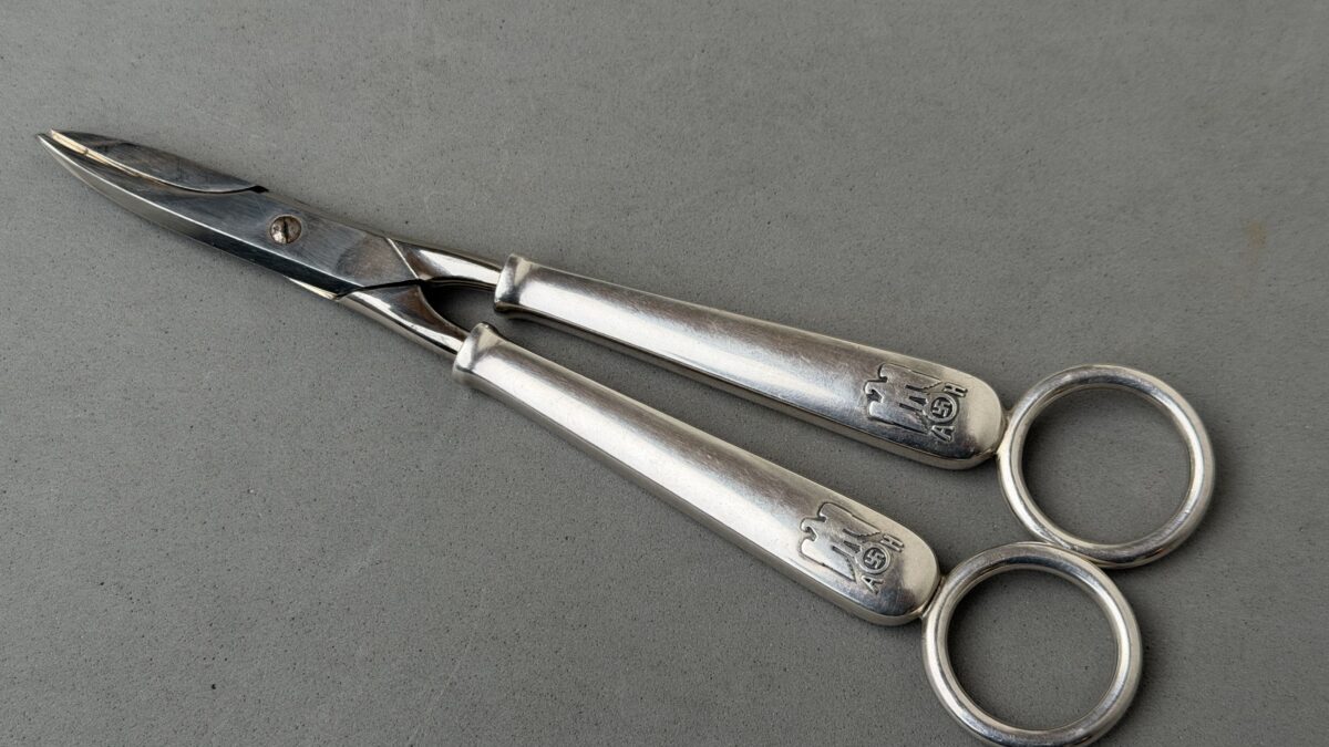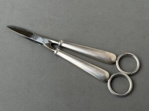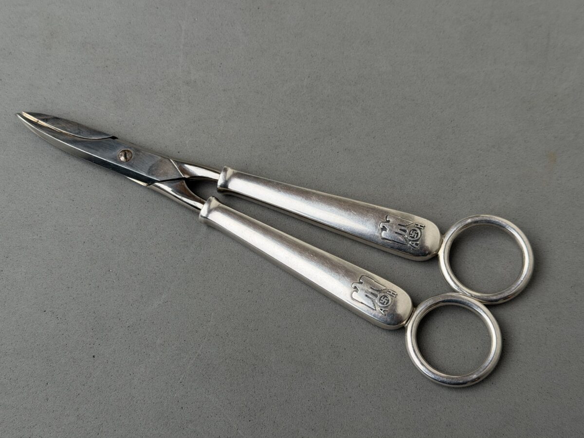 Adolf Hitler Informal Pattern Grape Snips-These are probably among the rarest of all the informal pattern pieces of silverware. I have never heard of another example ever being on the market. This is an example that is most likely missing from nearly all collections. It measures approximately 20 cm in length. Each handle has the very distinct stylized political eagle with wings down. The swastika is flanked by the letters “A. H.” Both handles have the textbook touch marks of the maker Bruckmann and are also marked “800 silver.” The base of both blades are marked with the capital letter S. This very rare example is in excellent condition.