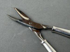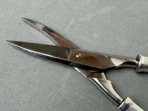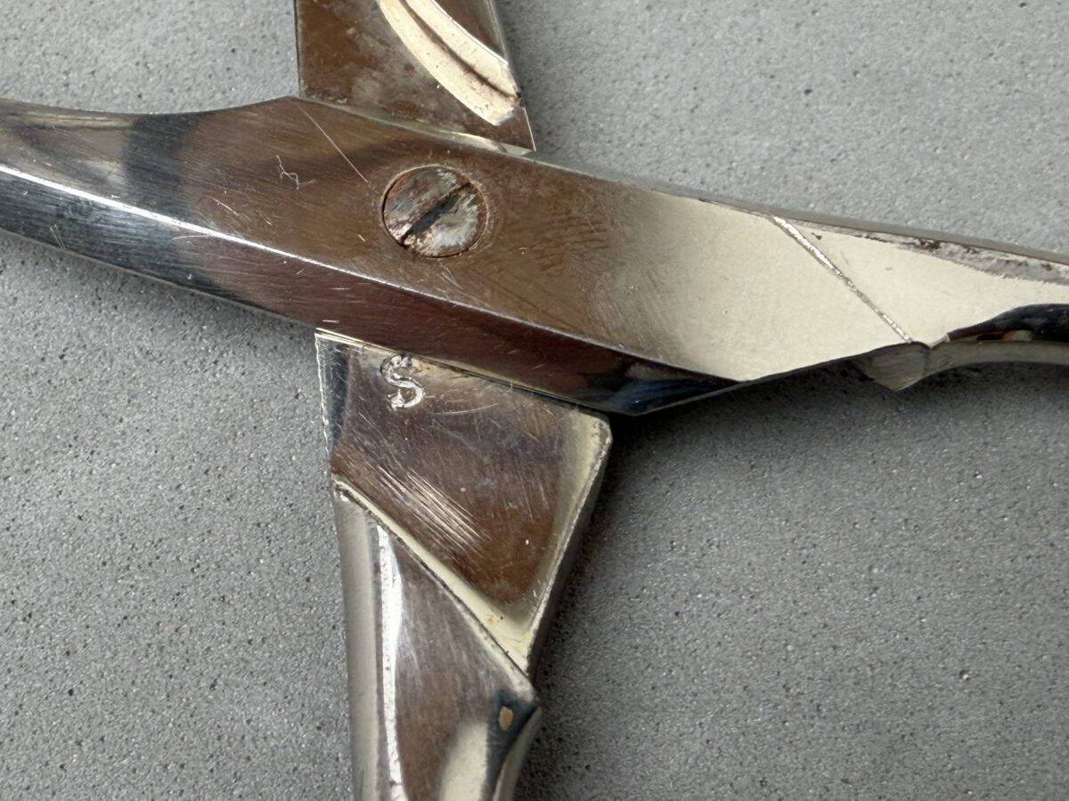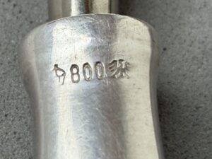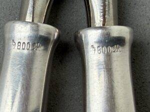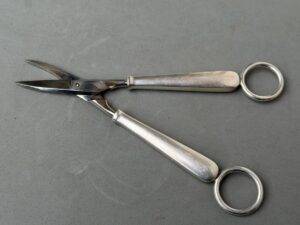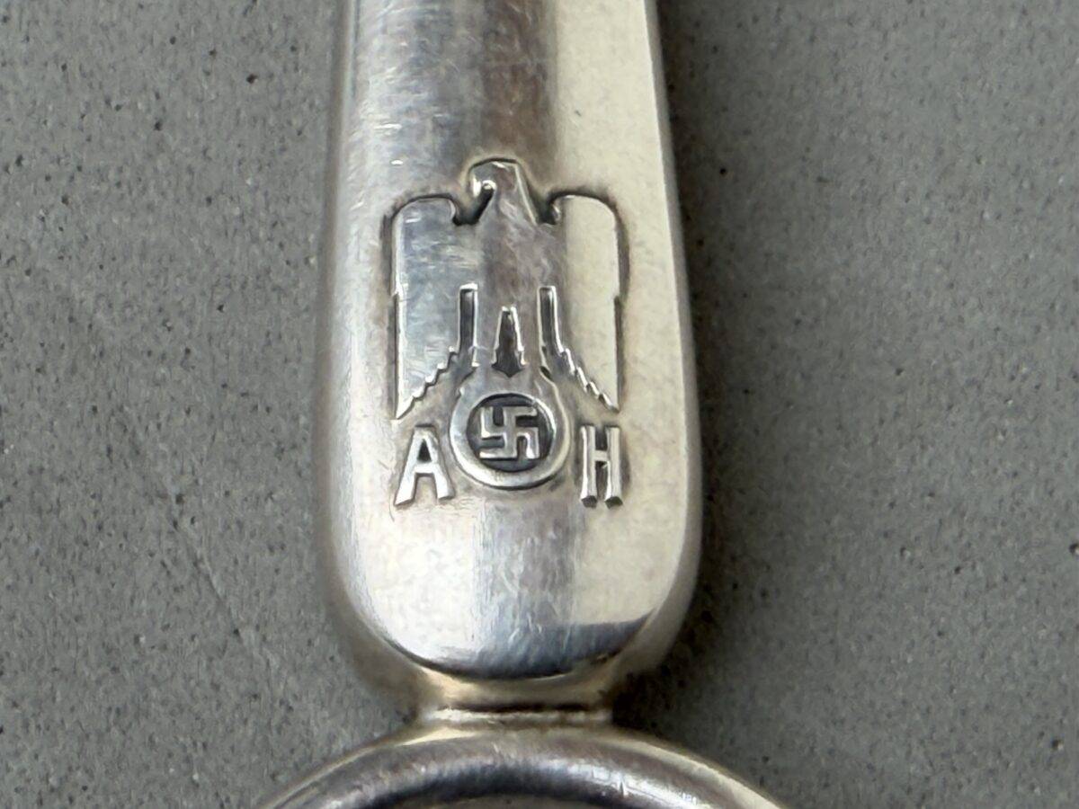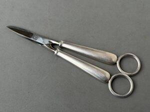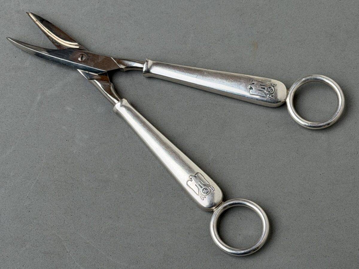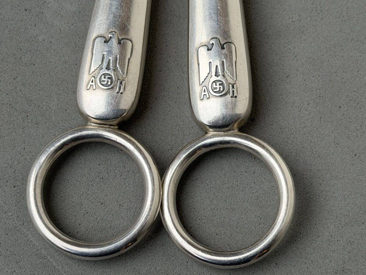 Adolf Hitler Informal Pattern Grape Snips-These are probably among the rarest of all the informal pattern pieces of silverware. I have never heard of another example ever being on the market. This is an example that is most likely missing from nearly all collections. It measures approximately 20 cm in length. Each handle has the very distinct stylized political eagle with wings down. The swastika is flanked by the letters “A. H.” Both handles have the textbook touch marks of the maker Bruckmann and are also marked “800 silver.” The base of both blades are marked with the capital letter S. This very rare example is in excellent condition.