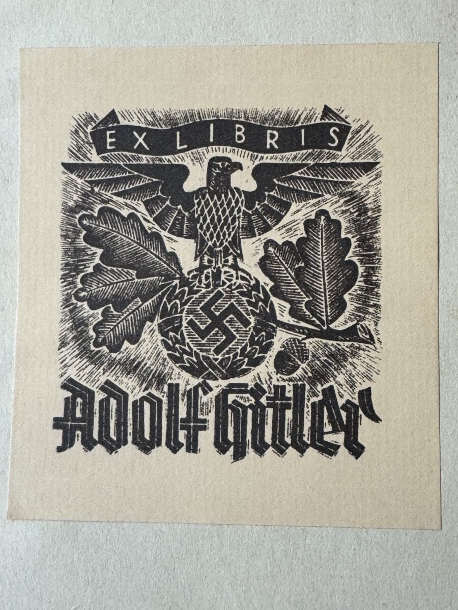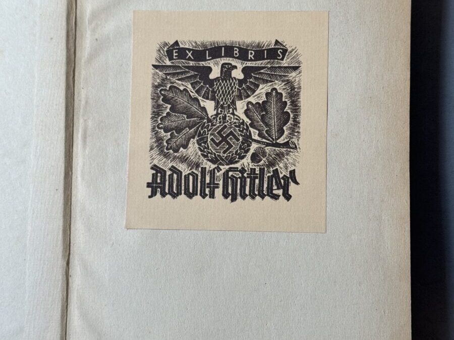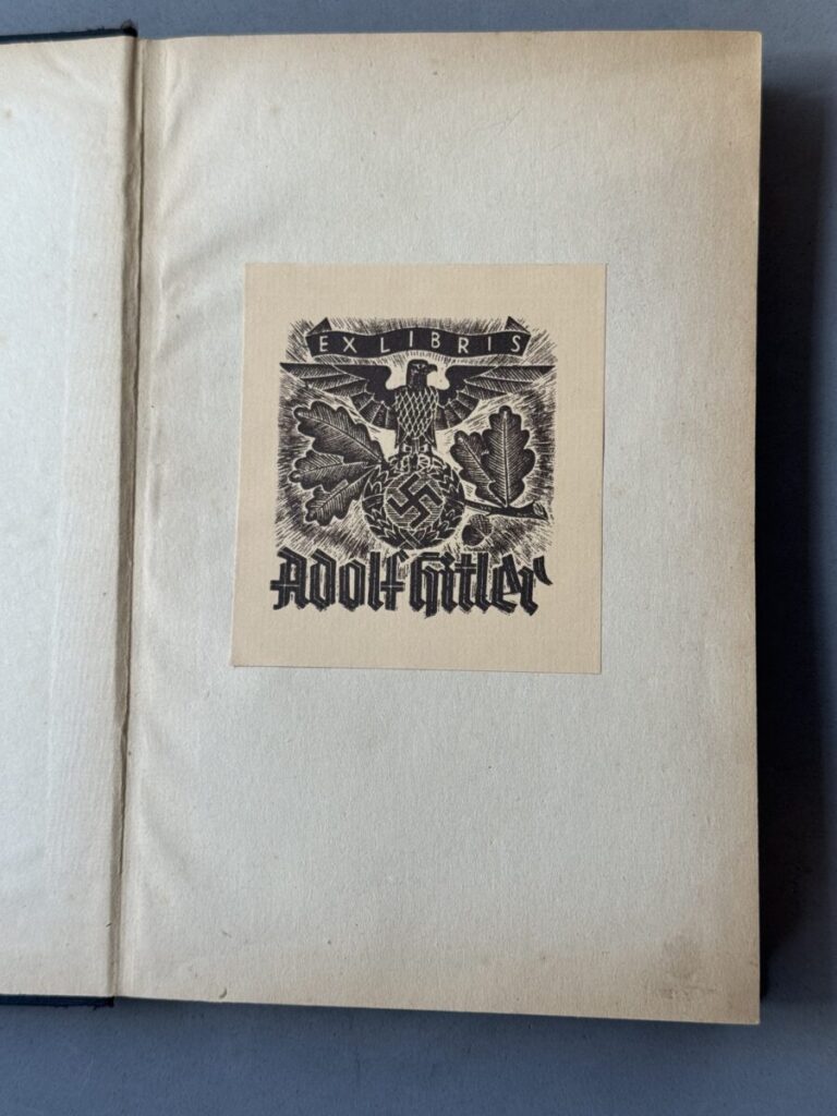 SOLD,SOLD,SOLD Adolf Hitler’s personal library book removed from the Berghof by a local resident after the war. The first page bears the label Ex libris in printed paper, 8×8 cm with the inscription: “Ex Libris Adolf Hitler” (“From the Library of Adolf Hitler”). The ex libris bears a monochrome image of an eagle and a swastika on an oak branch.