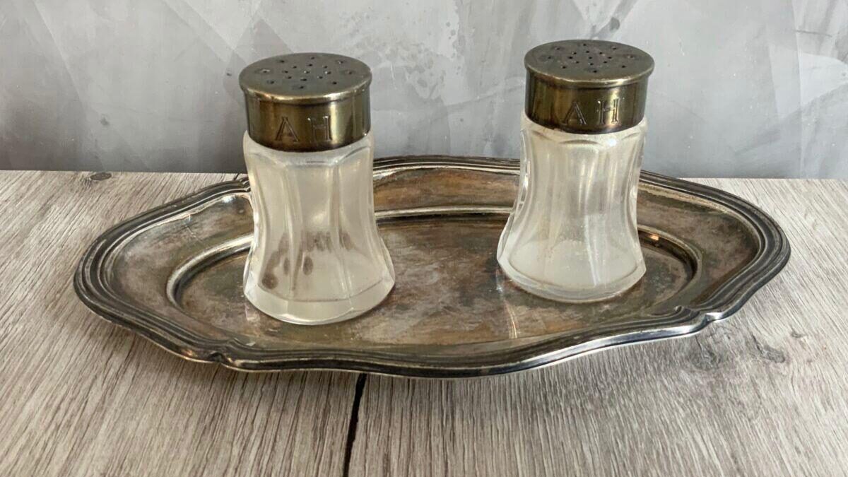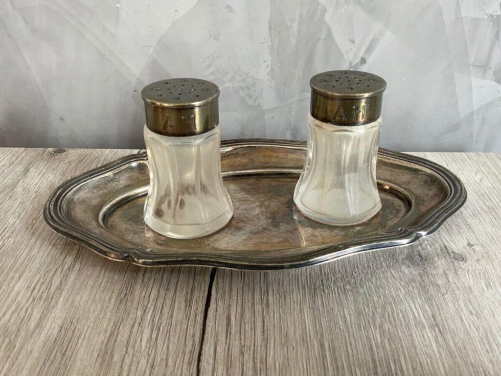 Here is an extremely rare set of formal Adolf Hitler salt and pepper shakers from the Berghof. These rarely emerge in pairs, especially under these conditions. The shakers were made by Wellner and the AH monogram was roll printed (not engraved). The tops are silver plated. The salt shaker still contains glass beads to prevent salt from building up.
