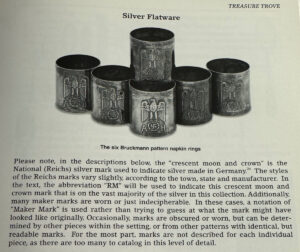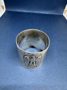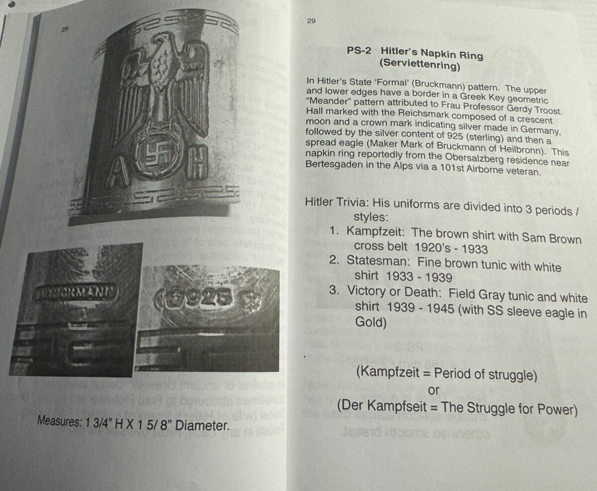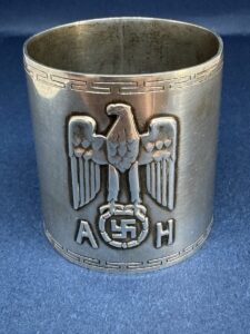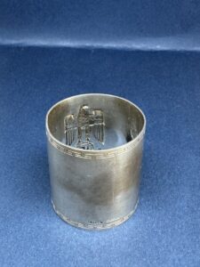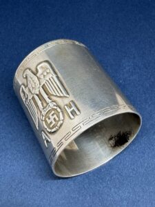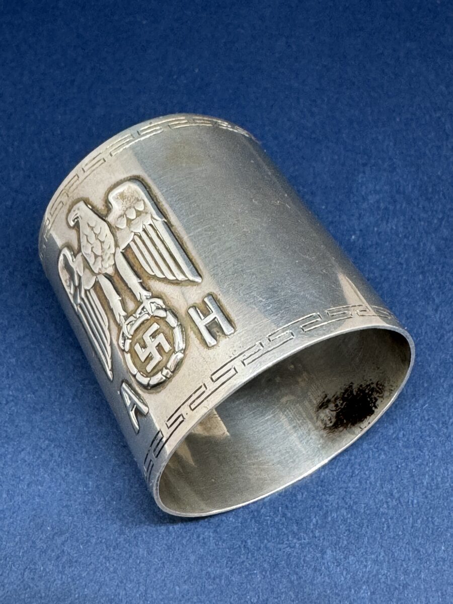 SOLD,SOLD,SOLD A superb silver napkin ring from Adolf Hitler’s personal formal silverware, it features a large embossed Fuehrer Adler (the Leader’s Eagle) clutching a wreathed Swastika which is flanked by Hitler’s initials ‘A’ & ‘H’. The opposite side of the ring has the impressed Bruckmann maker mark along with further hallmarks; a crescent moon, the imperial crown, the imperial eagle, and the silver purity mark ‘925’. The top and bottom of the ring have an impressed greek-key ‘Meander’ border. The formal silverware sets were distributed among the places Hitler frequented the most; the ‘Berghof’ (Hitler’s mountain home), ‘Kehlsteinhaus’ (the Eagle’s Nest), the ‘Gasthaus’ (Guest House) at Obersalzberg, the ‘Braune Haus’ (the ‘Brown House’), his ‘Prinzregentenplaz’ apartment in Munich, and the ‘Reichskanzlei’ in Berlin. The design for the AH Formal silverware is attributed to Adolf Hitler himself adding yet another level of desirable collectability to these pieces!