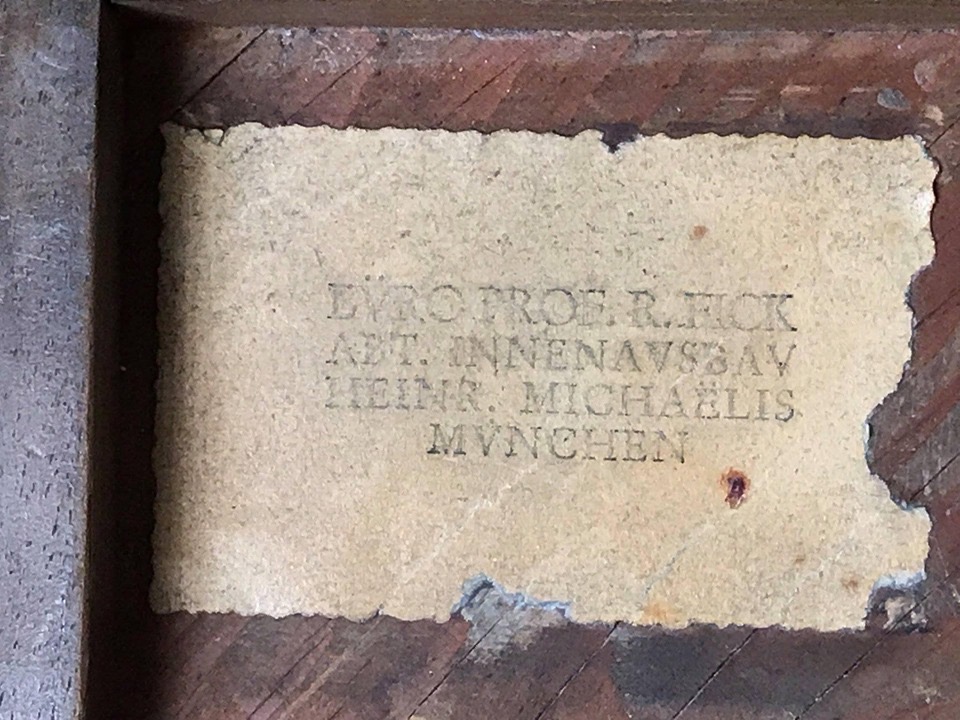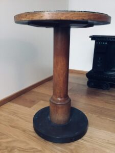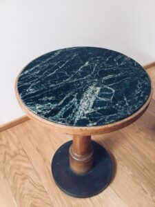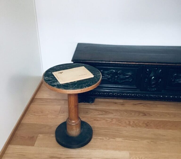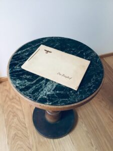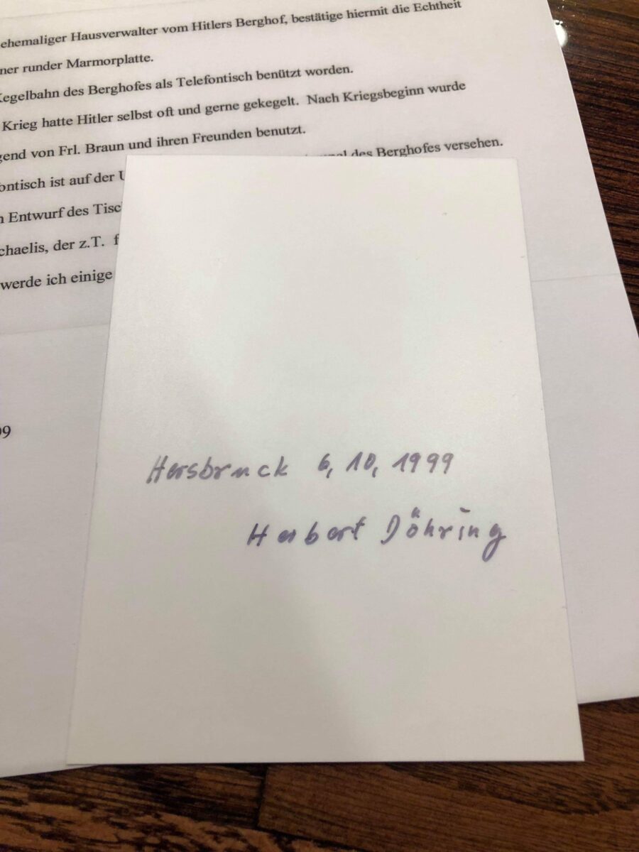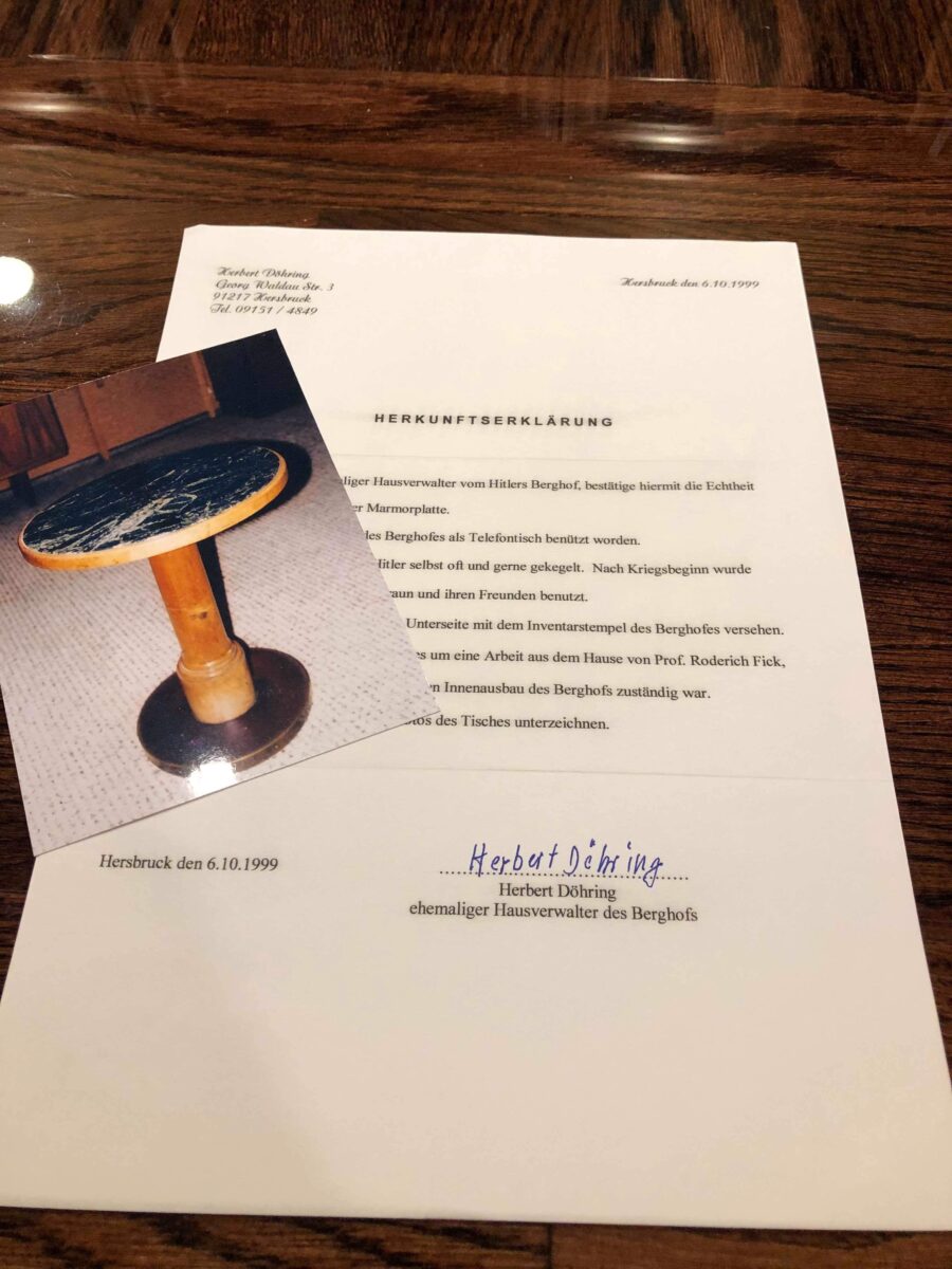 A round green marble table taken from the bowling alley inside the Berghof, used as a telephone table, and often used by Hitler himself during the war years. The table comes with great provenance, being personally authenticated by Herbert Dohring, who was Hitler’s administrator at the Berghof. Under the table is the Berghof inventory stamp number, as well as the name of the Architect Heinrich Michaelis responsible for the interior furnishings of the Berghof and the Eagle’s Nest.