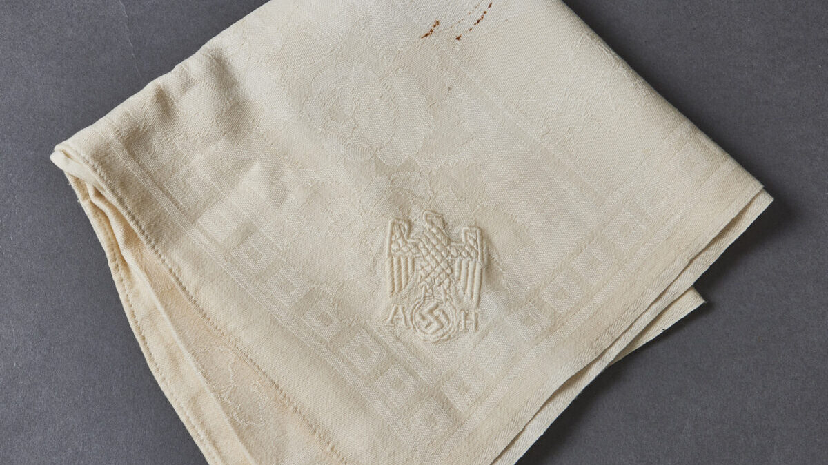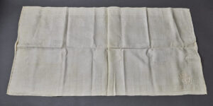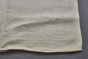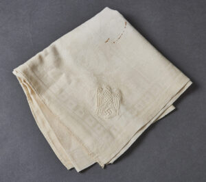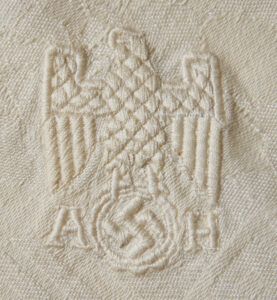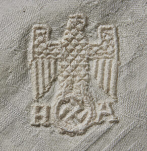 SOLD,SOLD,SOLD Adolf Hitler Formal Table Runner-This is a smaller sized table runner, measuring 19” wide by 36” long. It is produced in an off-white linen that has very minor discoloration only. There is a sewn in floral patter with a Grecian key motif around the edges. One corner has a large AH monogram eagle. Scarce and desirable!