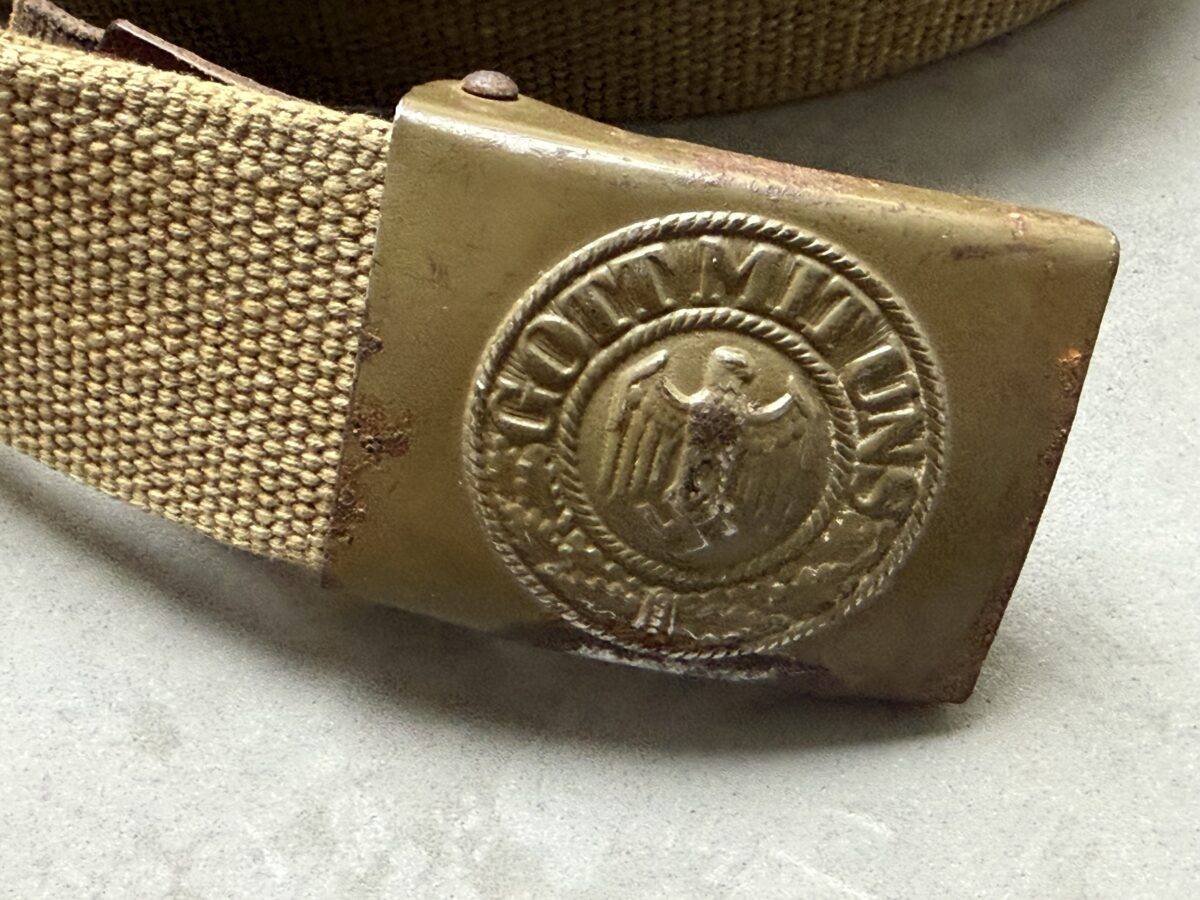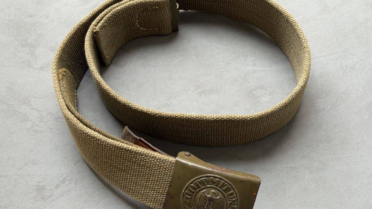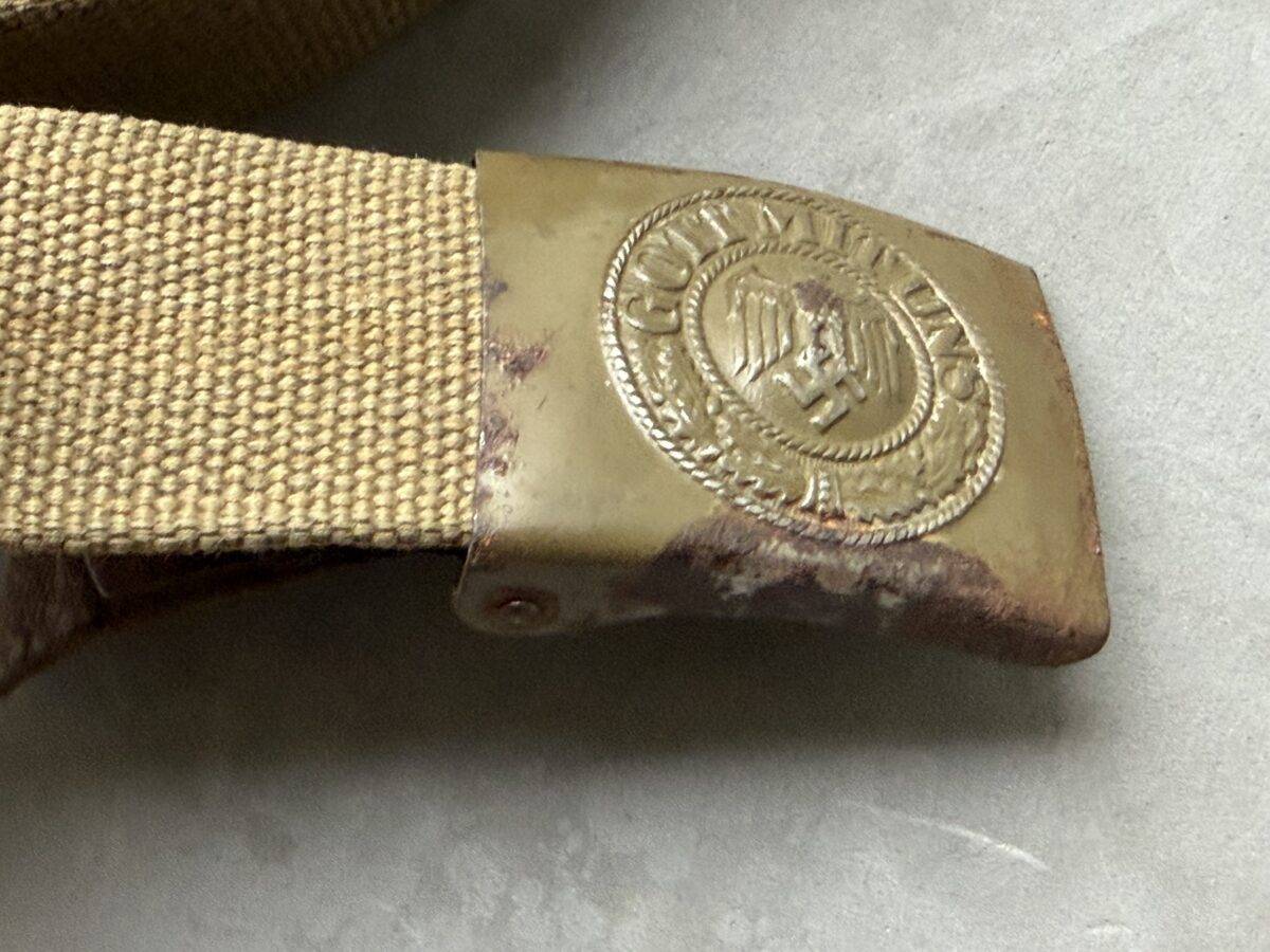 Rare Wehrmacht belt in tropical version in canvas, used by the soldiers of the Deutsche Afrikakorps, the Southern front and the Mediterranean front. The webbing belt is approximately 85 cm long and is accompanied by a green Heer buckle with leather flap 1940”. Rare set and in very good condition.