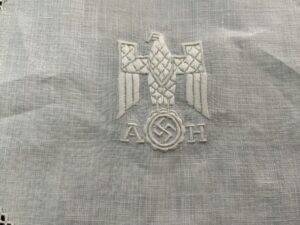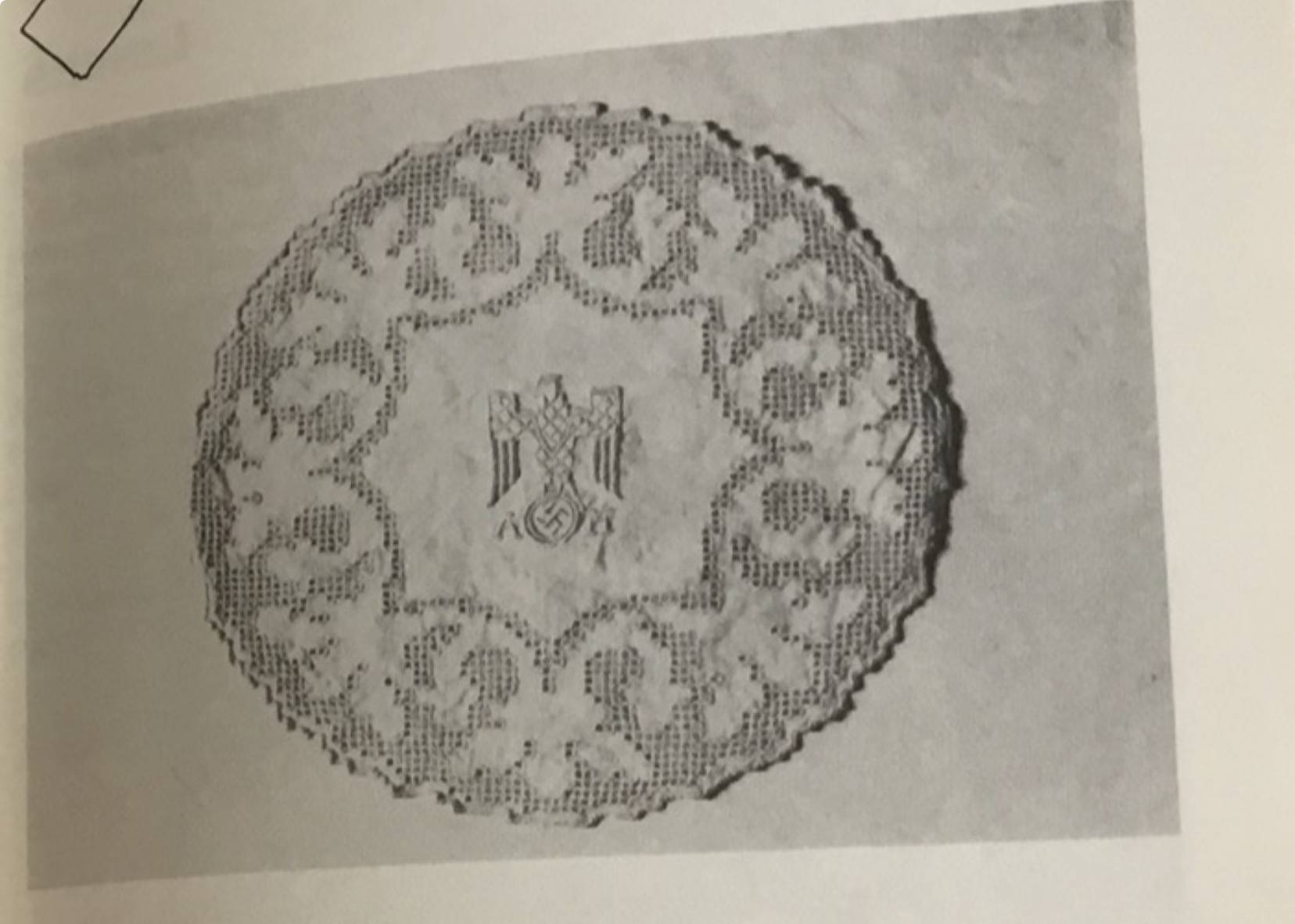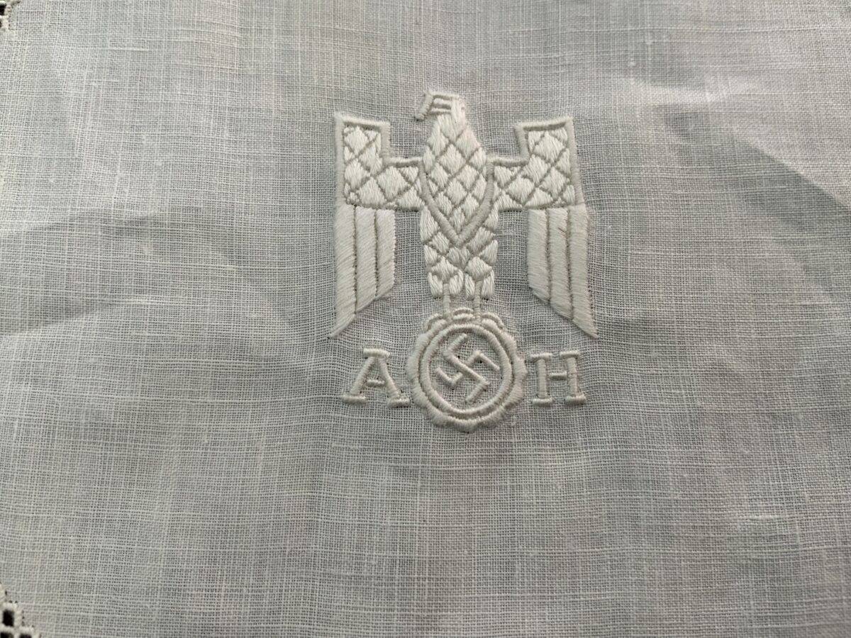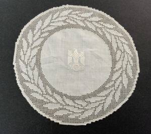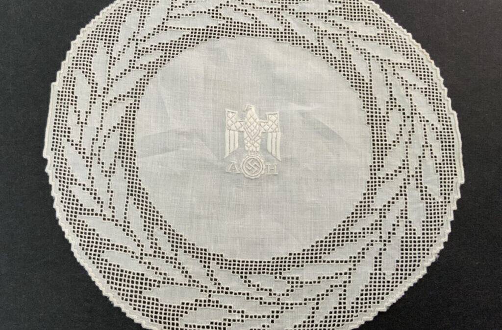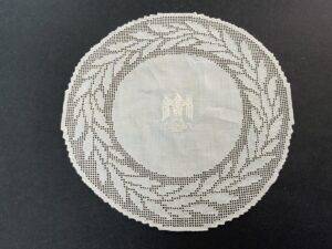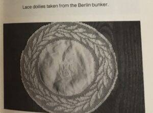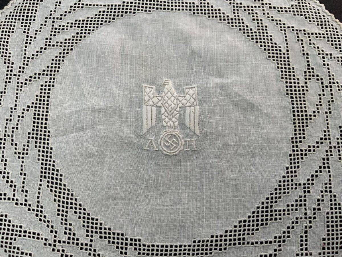 This doilie was removed from the Führerbunker by a member of the 82″d Airborne Division in May 1945. This doilie is covered in Dr. Griffith’s book Liberated Adolf Hitler Memorabilia.