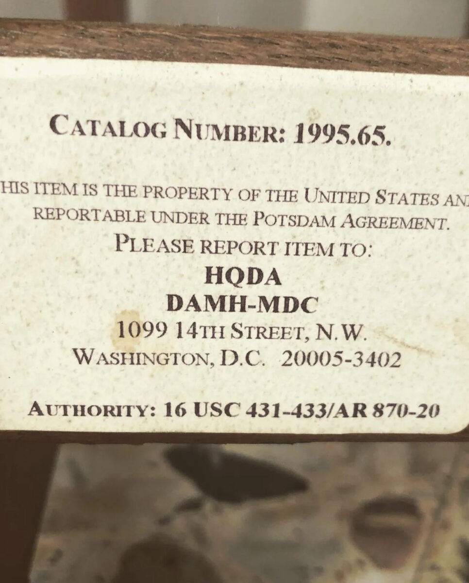 ON HOLD,ON HOLD,ON HOLD After the complex on the Obersalzberg assumed much greater importance in the Third Reich government, Hitler decided to build a second government seat in the Berchtesgaden area. This second Reichskanzlei (Reichs Chancellery) building and complex was built in 1936-37 in Stanggass, just northwest of Berchtesgaden. This Berchtesgaden Kanzlei was surrounded by a small complex of staff and security buildings, and served as a diplomatic center. The U.S. Army took the site over in 1945, and it served as the headquarters for the Berchtesgaden Recreation Area and Armed Forces Recreation Center until 1995. This chair was removed, along with several chairs and other furniture items, from the Berchtesgaden Chancellery at the end of the US occupation. On the base is the label with the official catalogue details attesting to it’s ownership by the United States.