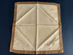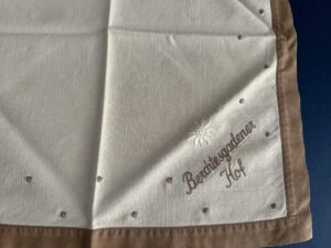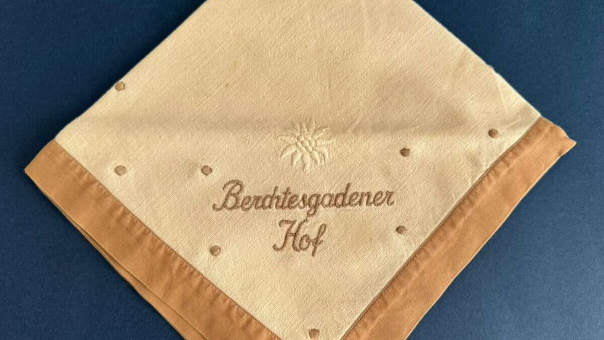 This beautiful napkin measures approx. 14 inches (35.56cm) by 15 inches (38.1cm) in size. It is made of an off-white linen that is bordered with light brown cloth border. There is the white edelweiss logo embroidered just above the brown script that reads Berchtegadener Hof. Along the edges and corners are small brown embroidered dots that give this napkin a great look. This napkin is from the famous Berchtesgadener Hof, the hotel located near Hitler’s Berghof at Berchtesgaden.