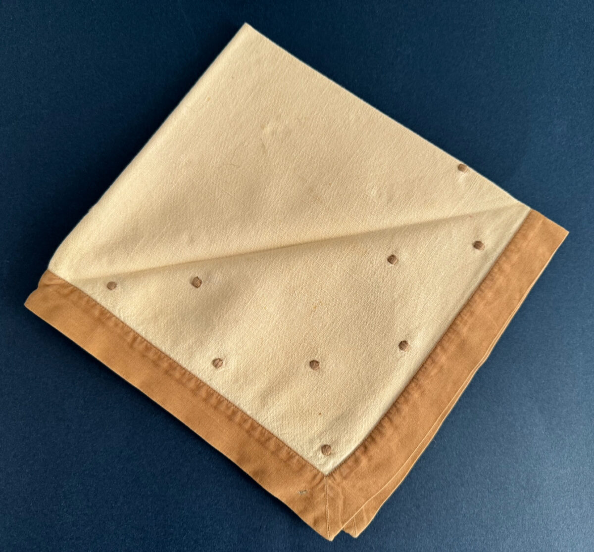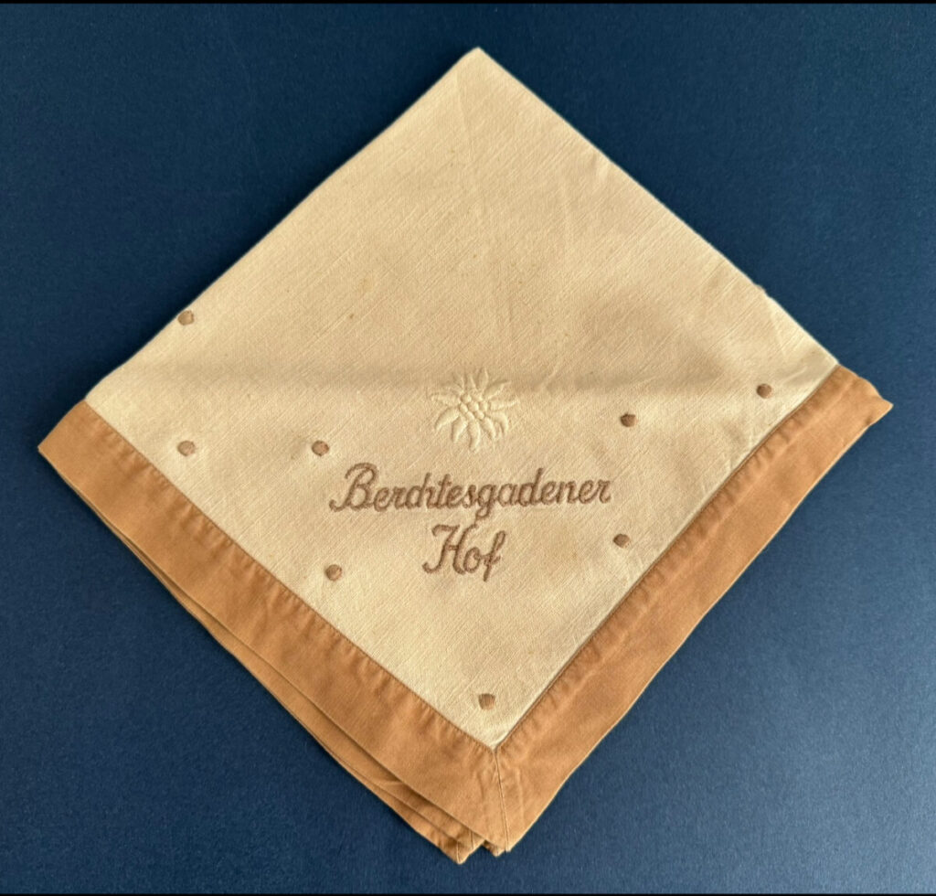 This beautiful napkin measures approx. 14 inches (35.56cm) by 15 inches (38.1cm) in size. It is made of an off-white linen that is bordered with light brown cloth border. There is the white edelweiss logo embroidered just above the brown script that reads Berchtegadener Hof. Along the edges and corners are small brown embroidered dots that give this napkin a great look. This napkin is from the famous Berchtesgadener Hof, the hotel located near Hitler’s Berghof at Berchtesgaden.