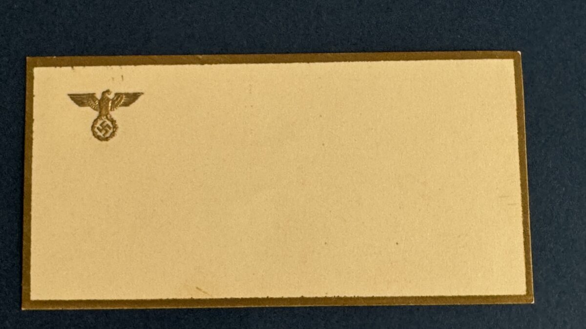 Individual name place card, gold border, gold embossed eagle from the formal dining hall.