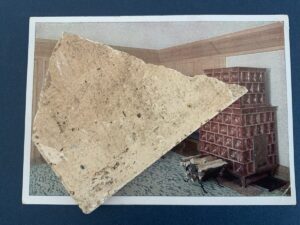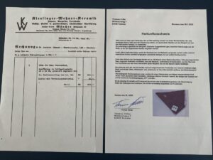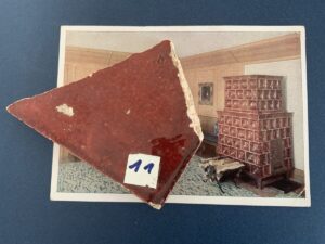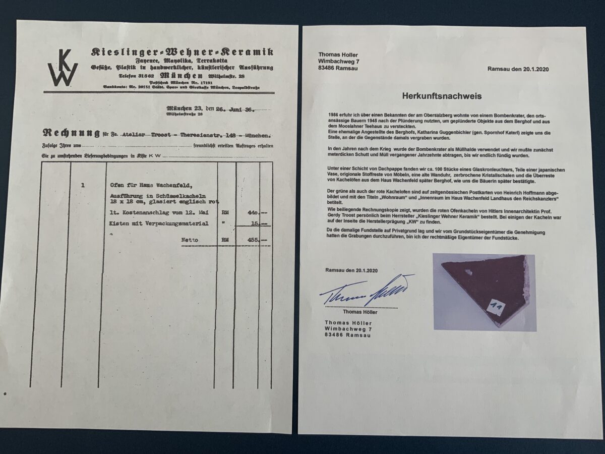 SOLD,SOLD,SOLD One rare pieces of stove tile, 10×9 cm, from Adolf Hitler’s mountain retreat and headquarters, the Berghof in Obersalzberg, near Berchtesgaden in the Bavarian Alps. The piece of glazed red-brown ‘English red’ ceramic were part of the original Kachelofen (masonry stove) to heat the living area of the ‘Unterberg’ room at ‘Berghof Wachenfeld’. The piece were excavated in 1986 by a local resident from Berchtesgaden. Included with the provenance is a copy of the invoice from the tile supplier Kieslinger-Wehner-Ceramic, Munich, to Atelier Troost, for ‘one stove for Haus Wachenfeld, Gerdi Troost was Hitler’s architectural and design adviser. A very fine personal relic with excellent provenance.