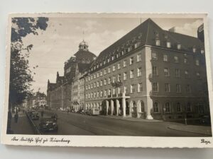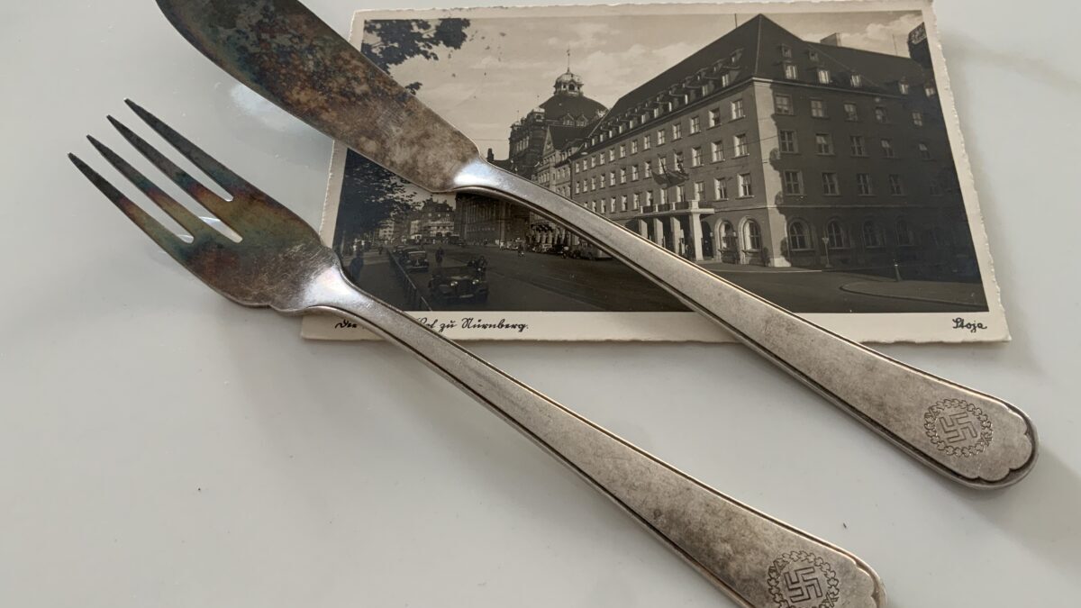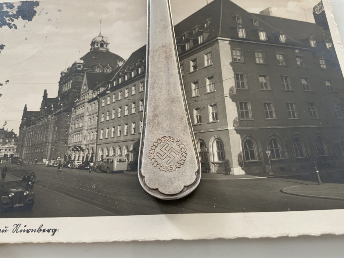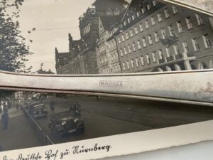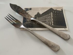 Rare fish fork and knife from the Der Deutsche Hof. The DH was Hitler’s favorite hotel and was located in the center of Nuremberg. The Führer always stayed there when he visited this medieval city and it became his headquarters during the Party rallies held each September.