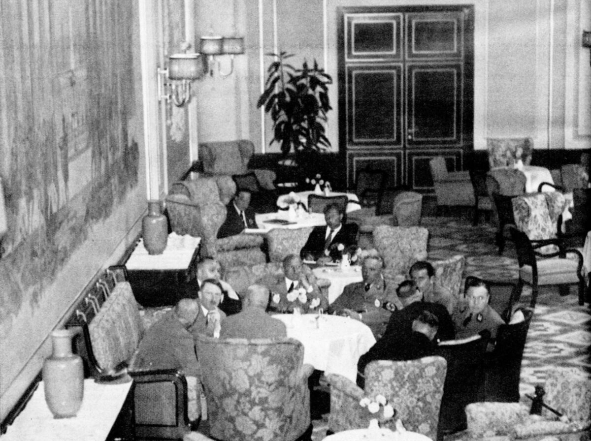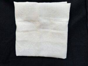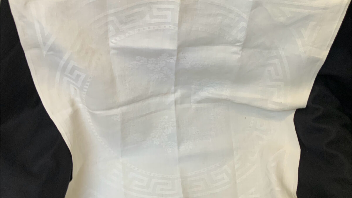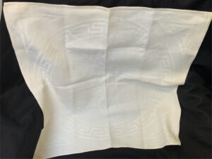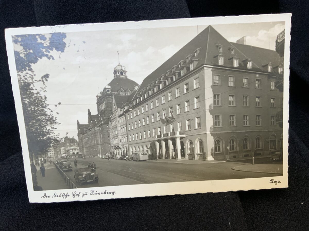 A small white,muslin tablecloth that shows a swastika in the center, surrounded by the Grecian Key motif.This shows just slight age toning but is otherwise excellent. The tablecloth measures 55 X 55 cm. This comes from the Der Deutscher Hof in Nuremberg.Der Deutscher Hof was Hitler’s favorite hotel and was located in the center of Nuremberg. The Führer always stayed there when he visited this medieval city and it became his headquarters during the Party rallies held each September.