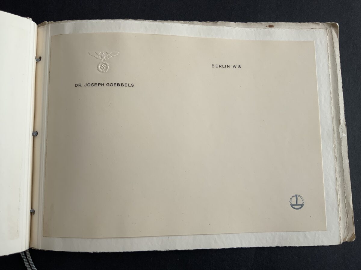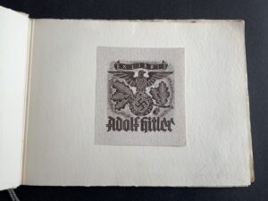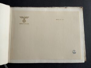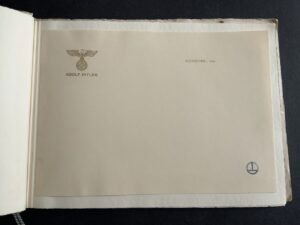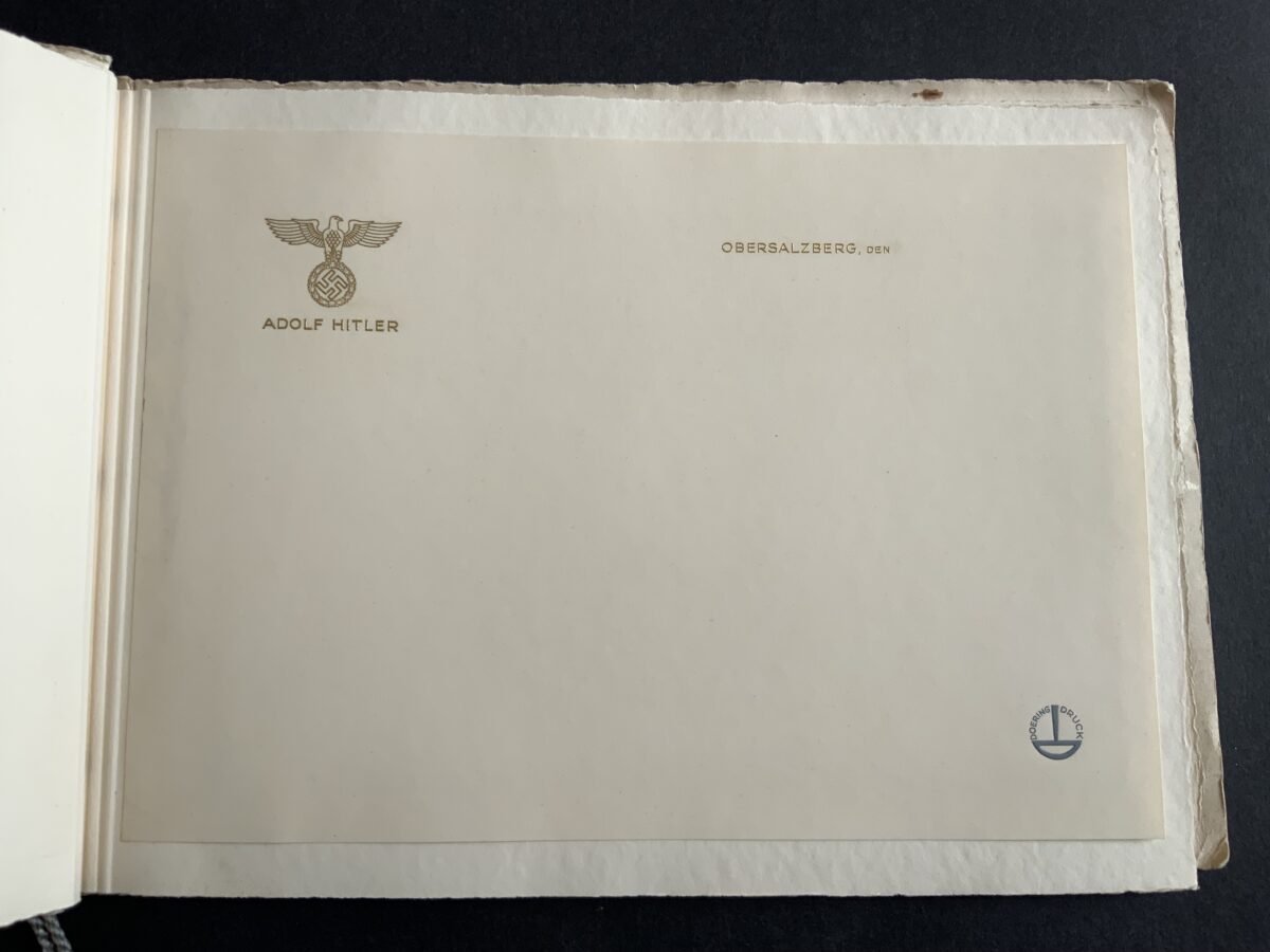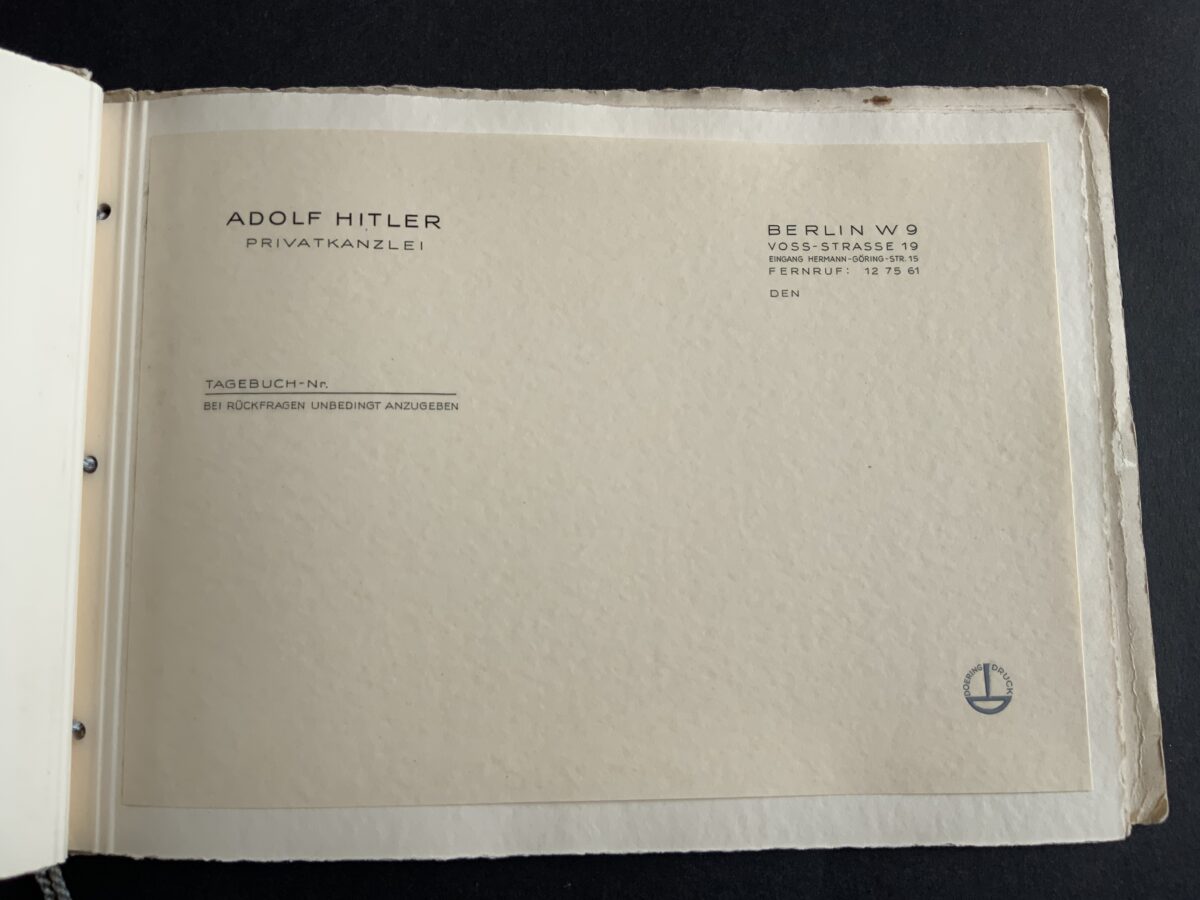 “This booklet was produced by the printing and stationery firm, Doering. It contains samples of all the main personal and Party stationery that were created for Hitler and other key party members. Most notable is an example of Hitler’s ‘Ex Libris’ bookplate, which appears on the first page — and has been signed/approved either by someone in the Party, or at the Doering firm itself. Also included are examples of Hitler’s own personal letterhead, for each of his three main residences: Berlin, Munich and Obersalzberg. “