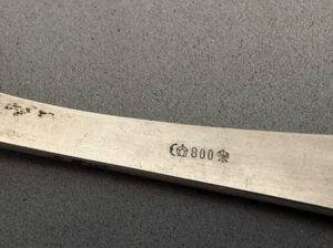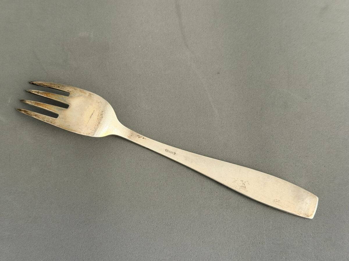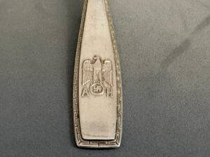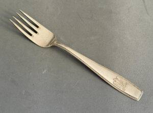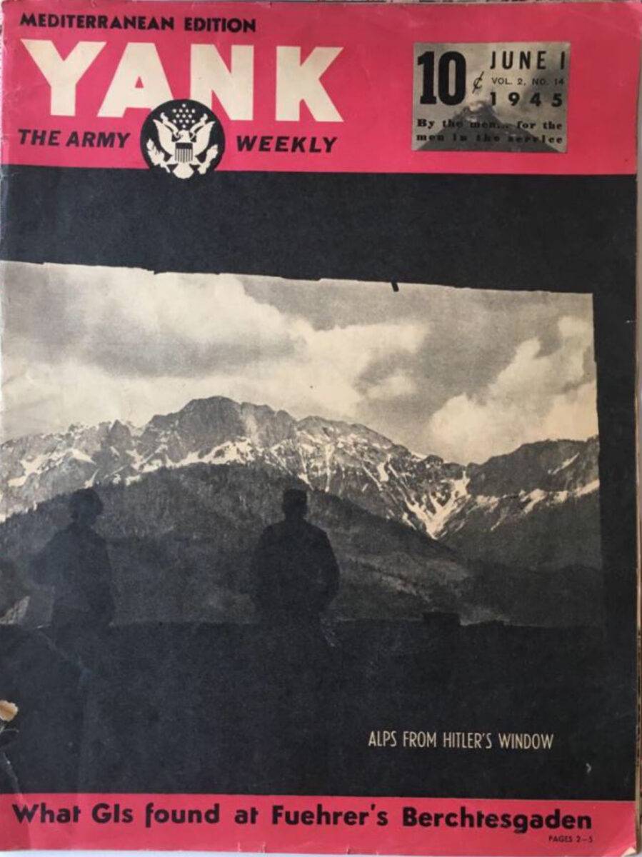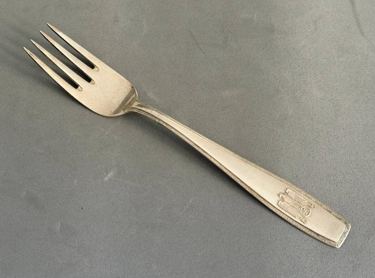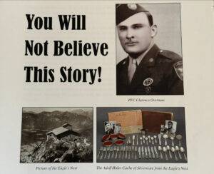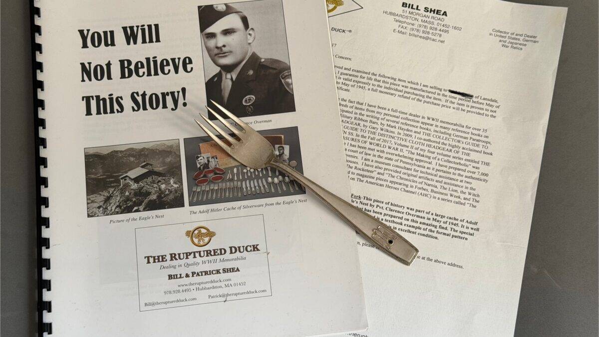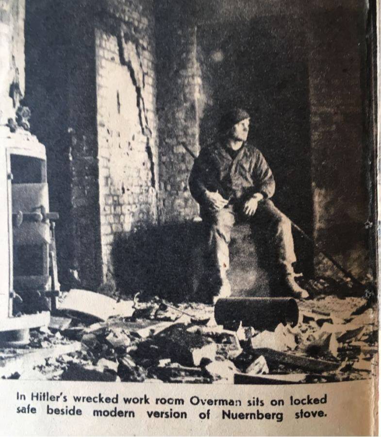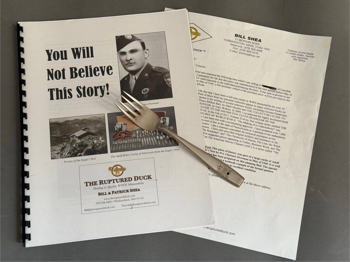 This piece of history was part of a large cache of Adolf Hitler silverware removed from the Eagle’s Nest by Pvt. Clarence Overman in May of 1945. It is well chronicled in the accompanying brochure that has been prepared on this amazing find. The special fork with four tines is approximately 18 cm long and is a textbook example of the formal pattern with the Grecian key edging and the proper trademarks. It is in excellent condition. Clarence Overman joined the 506th parachute infantry regiment of the 101st airborne in the late war period and arrived in Europe immediately after the Battle of the Ardennes.In May 1945, along with his team, he was one of the first to arrive in Berchtesgaden, the former home of the now-dead Hitler and his infamous Eagle’s Nest.Clarence and his team were selected to enter the building, where they took many pieces of monochrome AH silverware, including this fork.During his time in Berchtesgaden, Clarence also visited Hitler’s studio in his main residence, the Berghof, where he was interviewed by Yank Magazine.A cut from that article appears below, plus a photo of Clarence sitting in the safe of Hitler’s office.