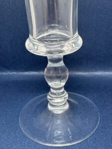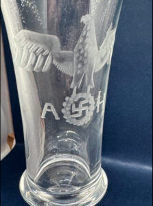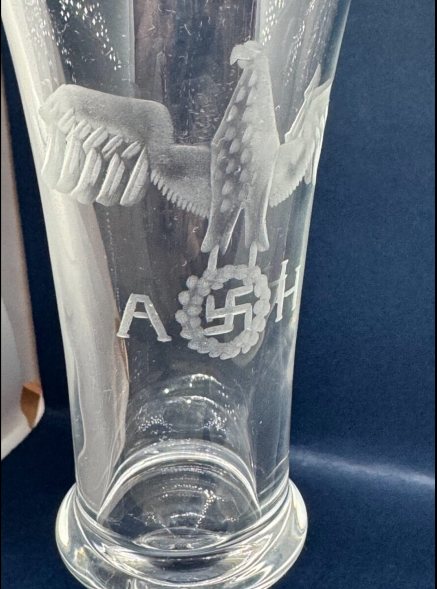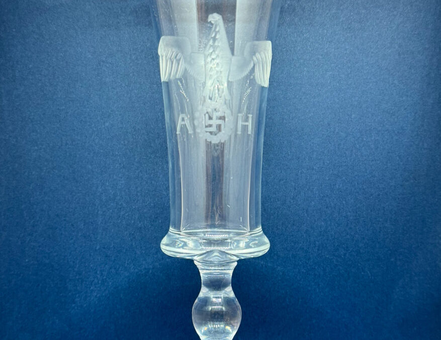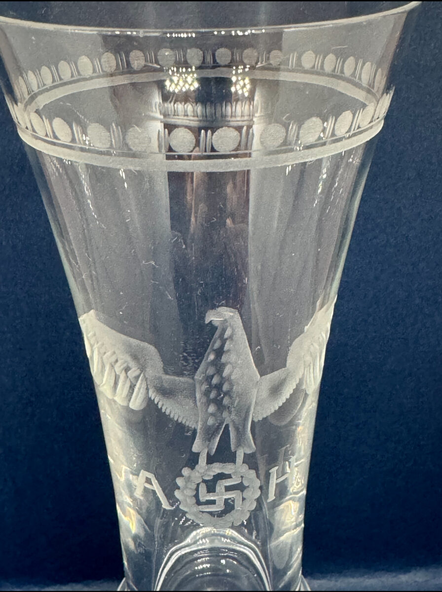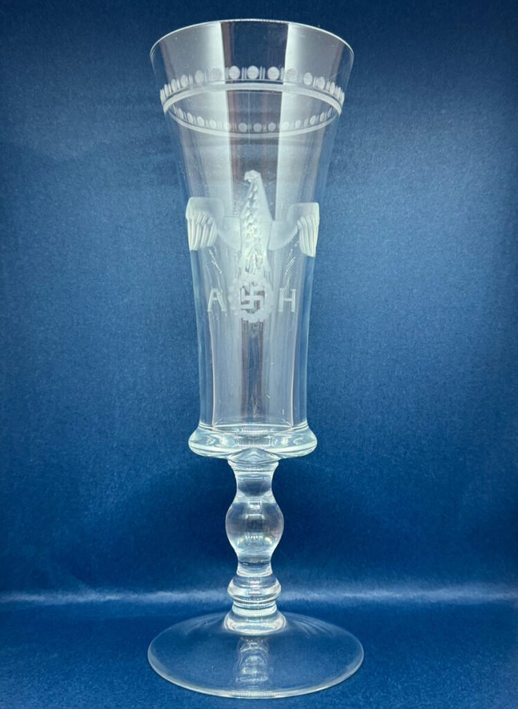 Rare Adolf Hitler champagne glass, In the center is a political eagle with half open wings clutching a wreath with immobile swastika. On either side of the wreath is the initials “AH”. The only location this glassware was known to be used was inside Hitler’s Eagle’s Nest.