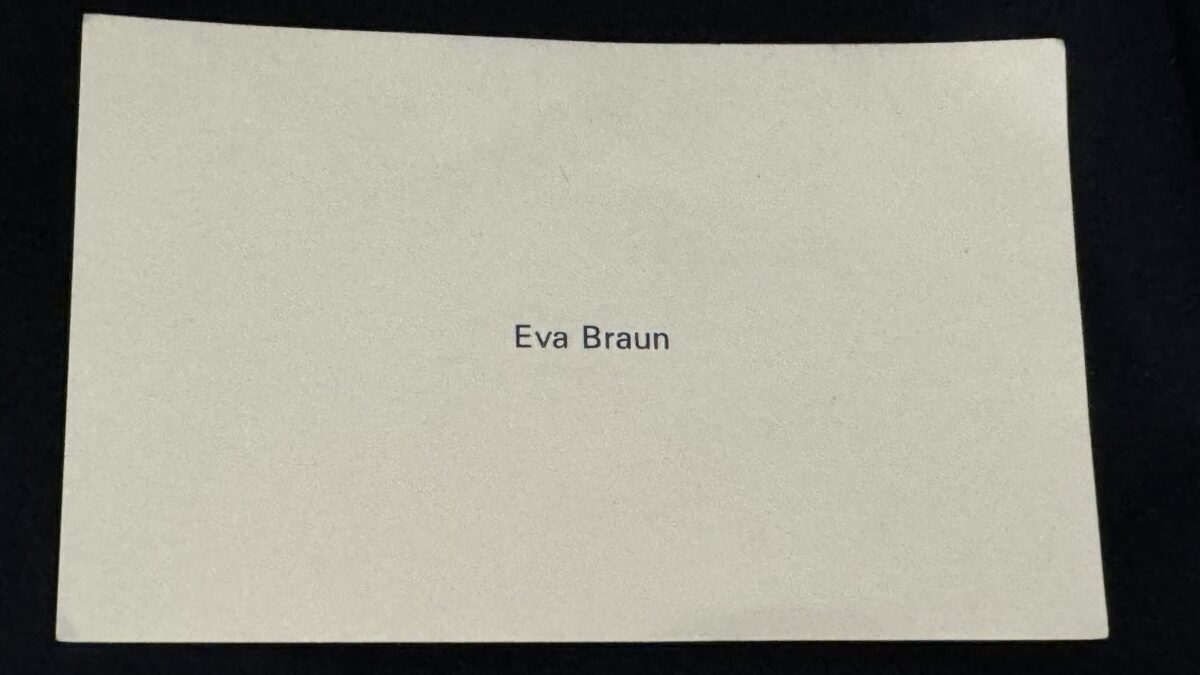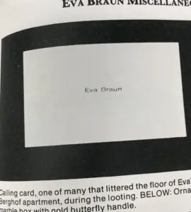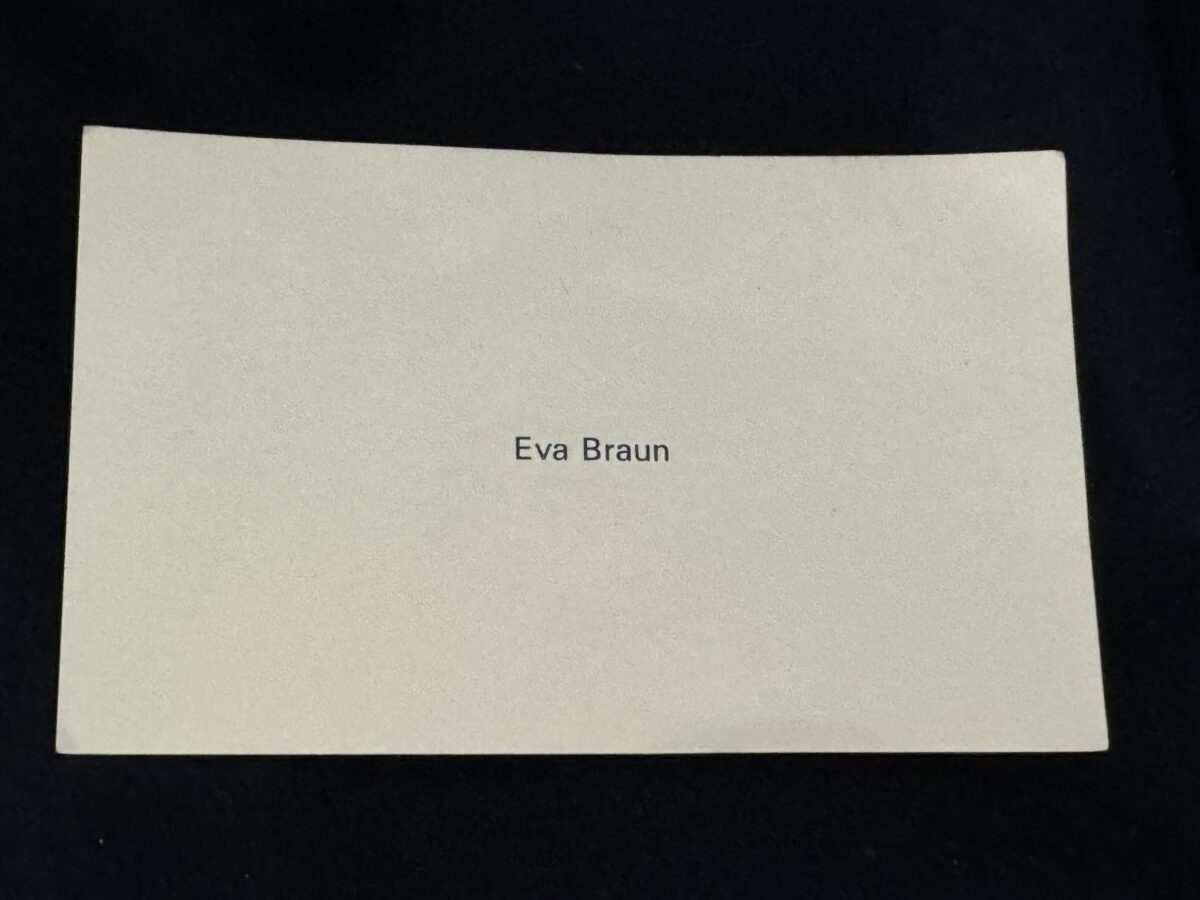 Her personal calling card from the Berghof. This same type card is shown on page 67 of “COLLECTOR’S GUIDE TO ‘LIBERATED’ ADOLF HITLER MEMORABILIA”, Vol. II by Mark D. Griffith M.D.