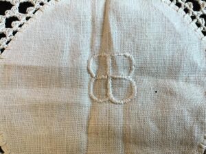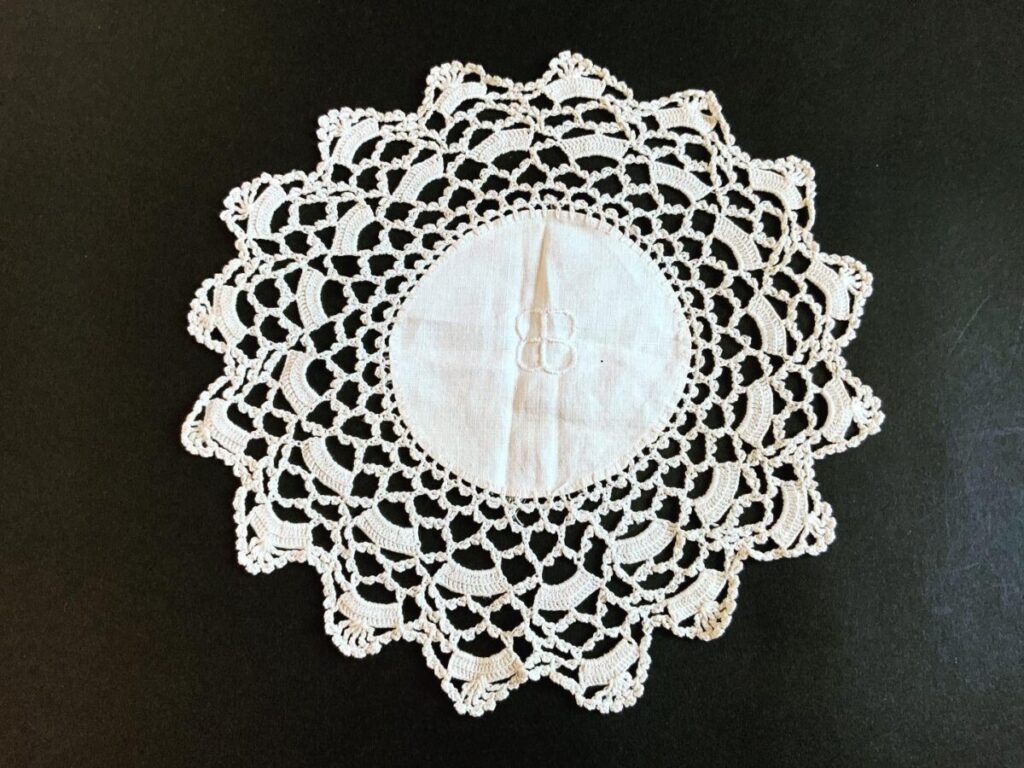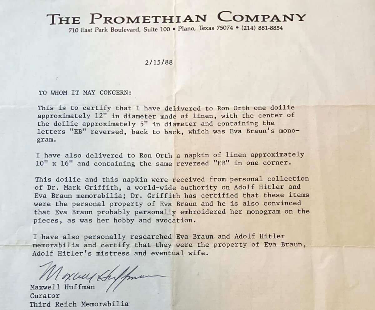 EB-monogrammed doily from the Berghof, acquired originally by the late and noted Texan collector, Ben Swearingen from Gretl Braun. They were then owned by Dr Mark Griffith, author of the ‘Collector’s Guide to Liberated Adolf Hitler Memorabilia, before being sold to another collector in 1988. Includes the original letter detailing Dr Griffith’s ownership, the doyle are also visible in his books.