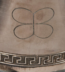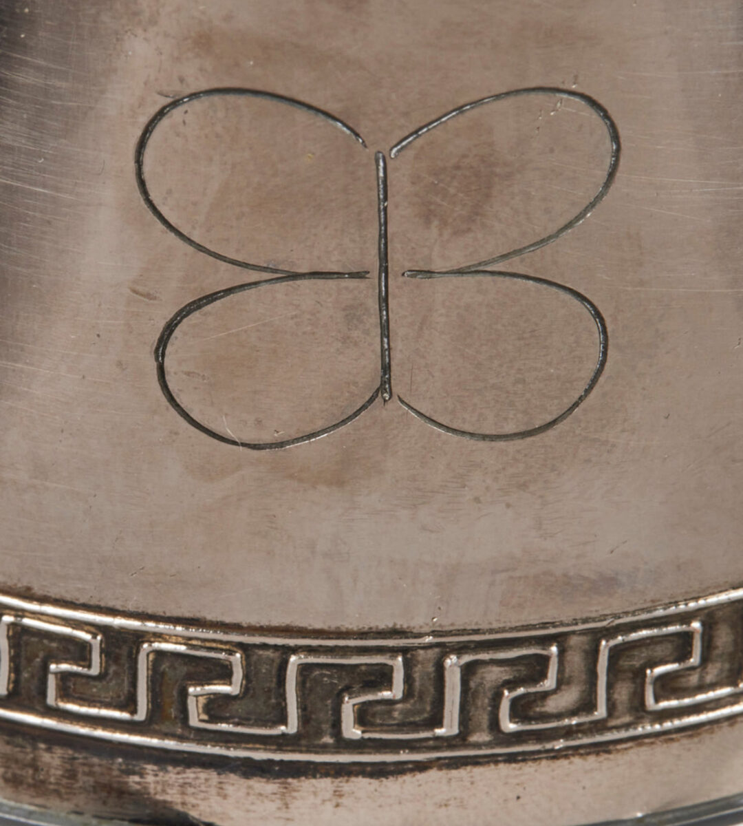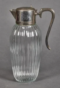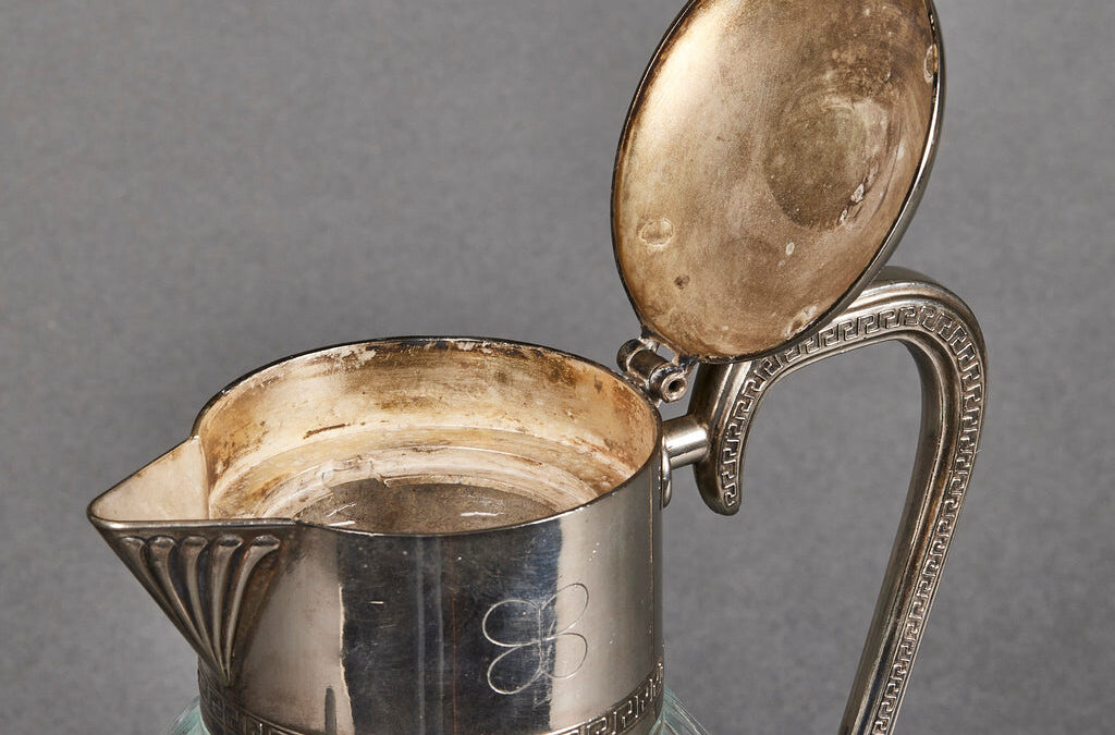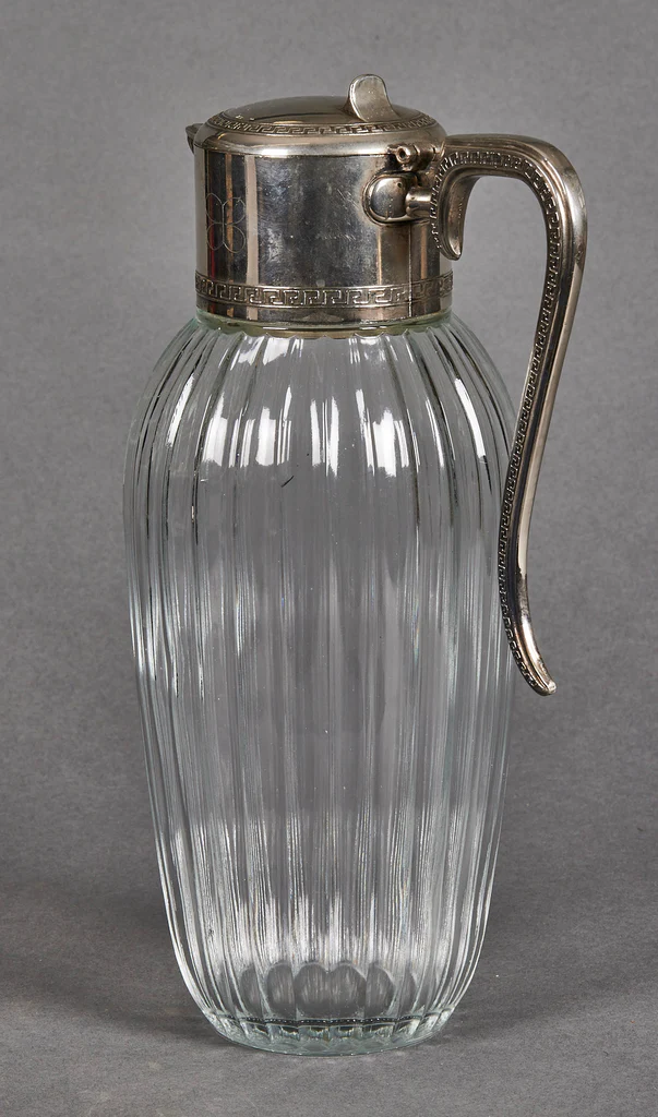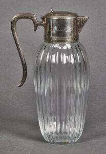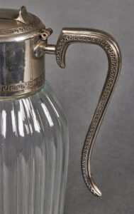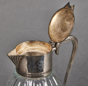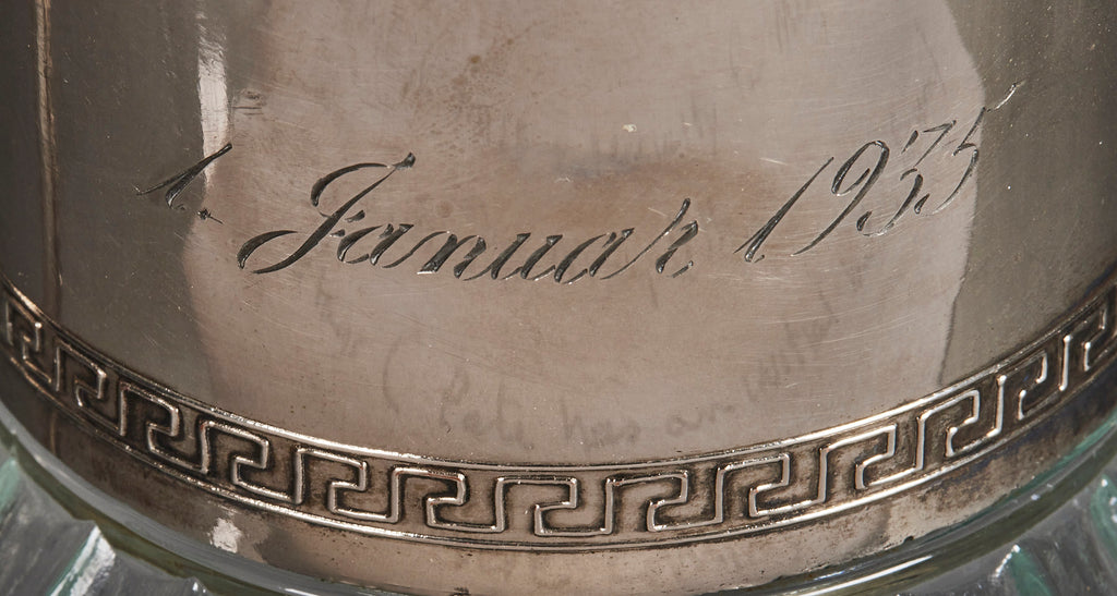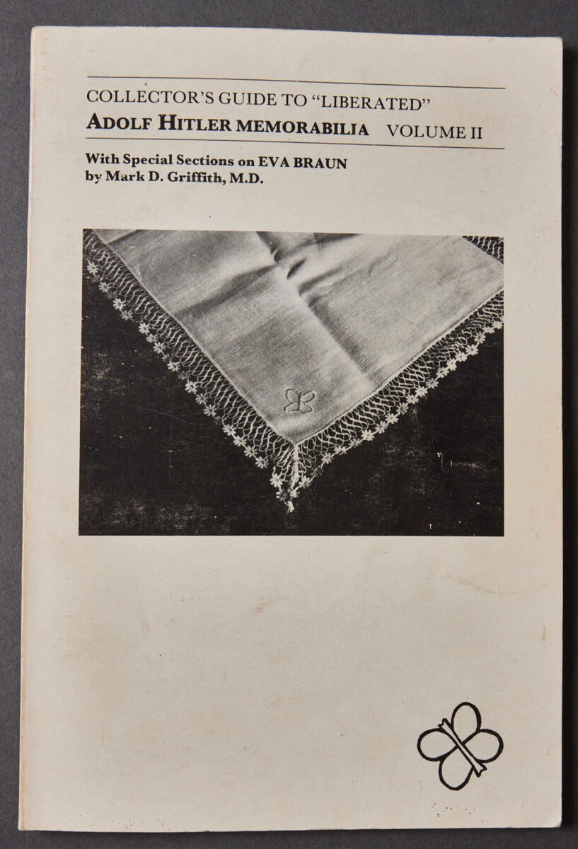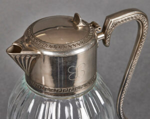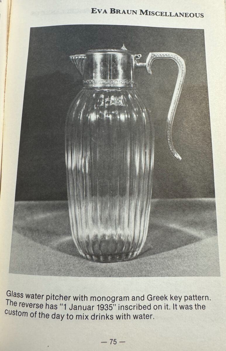 Eva Braun Presentation Water Carafe, Documented-This exact piece is listed on page 76 in the book Collector’s Guide to “Liberated” Adolf Hitler Memorabilia, Volume II by Dr. Mark D. Griffith, M.D. It is a beautifully made, cut crystal glass pitcher with nickel plated lid, handle and spout. There is a Grecian key motif around the perimeter of the lid, on each side of the handle and around the base of the lid. The “EB” monogram is seen on one side and there is a presentation on the opposite side that is simply the date 1. Januar 1935. This impressive piece measures a little over 30 cm tall with a base that measures 9 cm in diameter. The carafe is wider at the middle. One of a kind and very nice!