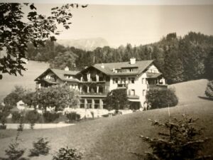 Another local hotel with Third Reich connections was the Hotel Geiger, located up the street from the Berchtesgadener Hof. The hotel was used as a rest and recreation center for Luftwaffe officers during the war, and as area headquarters for Luftwaffe Gen. Karl Koller in May 1945. It briefly served as regimental headquarters for the 506th Parachute Infantry Regiment of the U.S. 101st Airborne Division after the taking of Berchtesgaden in May 1945, and was also used as a U.S. Army facility for a period after the war, but has now (until 2018) stood vacant for several years. The interior still had several period rustic paintings of mountain scenes, such as those on the bar seen here. Over years of abandonment and neglect, most of the interior decorations (including those shown here) were plundered. Demolition of the ruined and plundered Hotel Geiger was completed in December 2018.