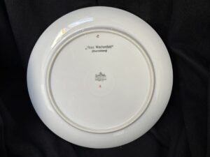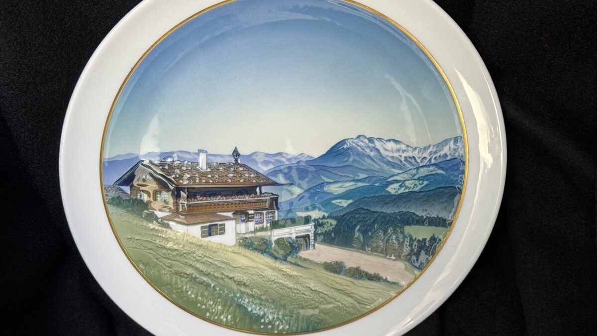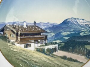Nice porcelain plate by Rosenthal showing Hitler’s Berghof Haus Wachenfeld in Obersalzberg. Hand painted, no chips, cracks, or discoloration. A souvenir as it was sold in Berchtesgaden and in the Obersalzberg area to tourists who visited the place where Adolf Hitler had his mountain residence. Hitler purchased the Haus Wachenfeld with the profits of his book Mein Kampf and lived there as he purchased it until he became Chancellor of Germany in 1933. He then greatly enlarged the Haus Wachenfeld and renamed it Berghof because of its position on the top of a mountain in Obersalzberg above the Bavarian city of Berchtesgaden.