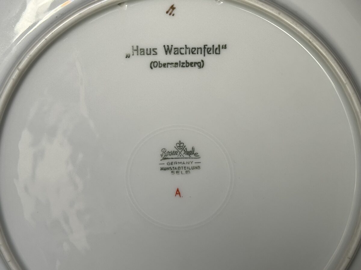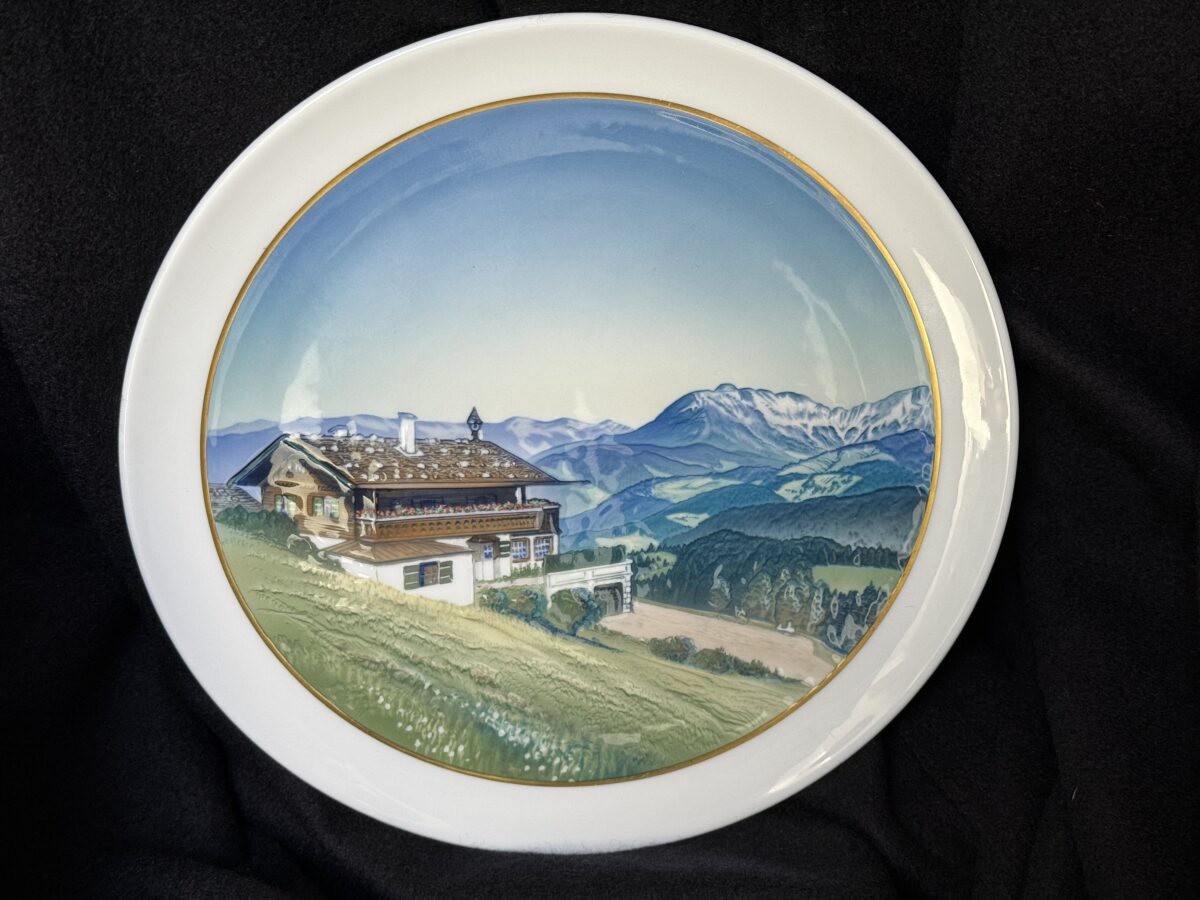 Nice porcelain plate by Rosenthal showing Hitler’s Berghof Haus Wachenfeld in Obersalzberg. Hand painted, no chips, cracks, or discoloration. A souvenir as it was sold in Berchtesgaden and in the Obersalzberg area to tourists who visited the place where Adolf Hitler had his mountain residence. Hitler purchased the Haus Wachenfeld with the profits of his book Mein Kampf and lived there as he purchased it until he became Chancellor of Germany in 1933. He then greatly enlarged the Haus Wachenfeld and renamed it Berghof because of its position on the top of a mountain in Obersalzberg above the Bavarian city of Berchtesgaden.