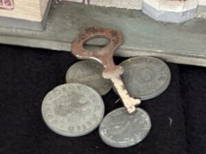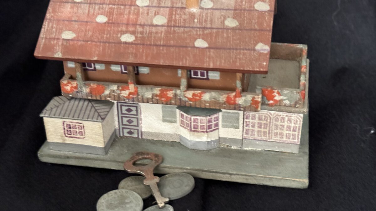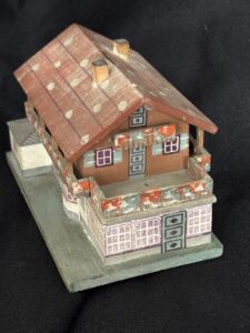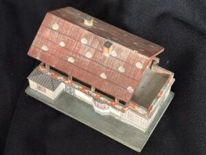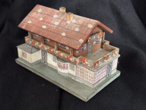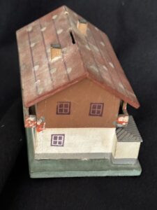 Souvenir “Haus Wachenfeld” savings box. Painted wood model of Hitler’s mountain retreat. Slot in roof for depositing coins. 13,5 x 11 cm.Very good condition, including key and Reichsmark coins.