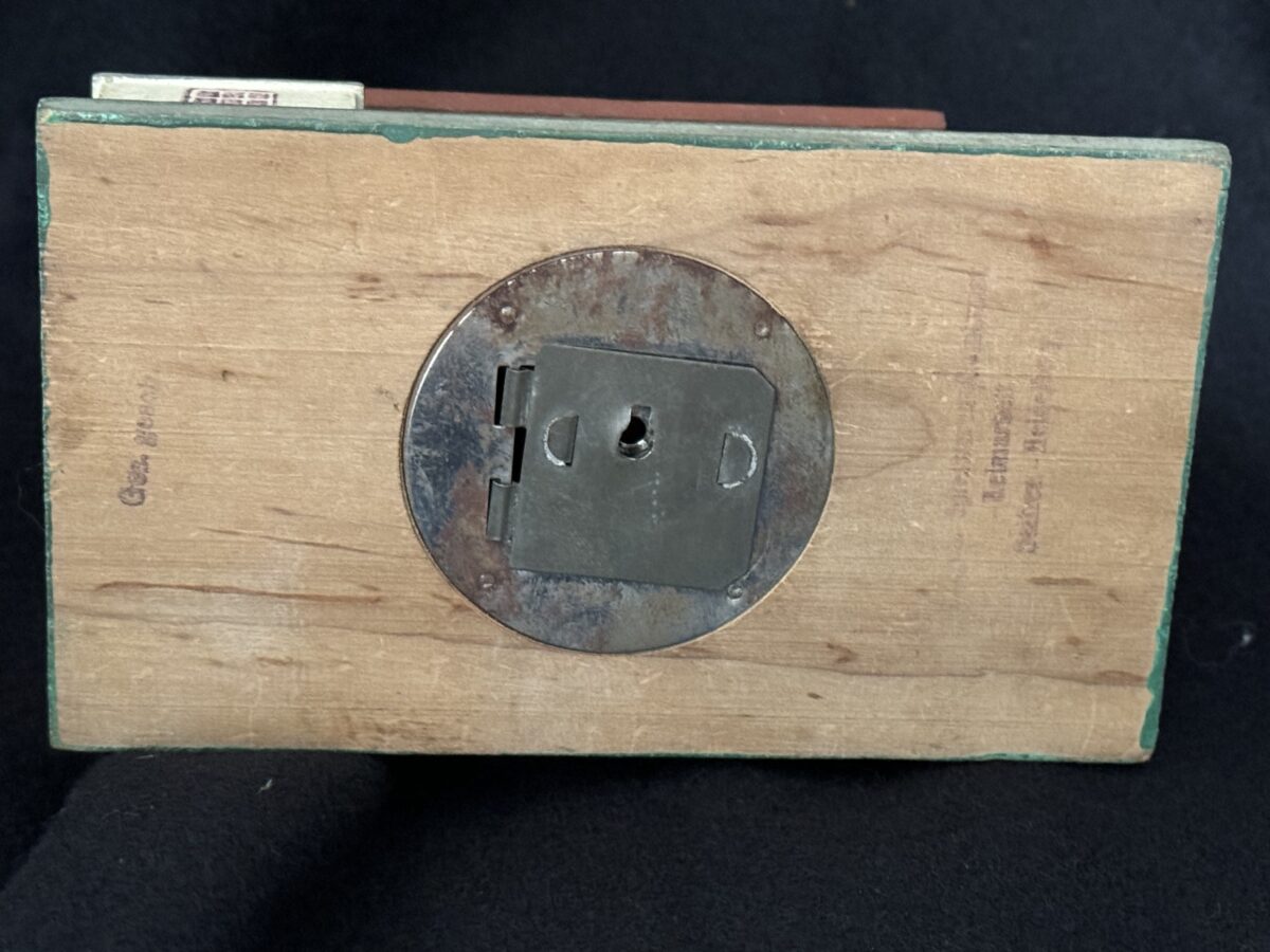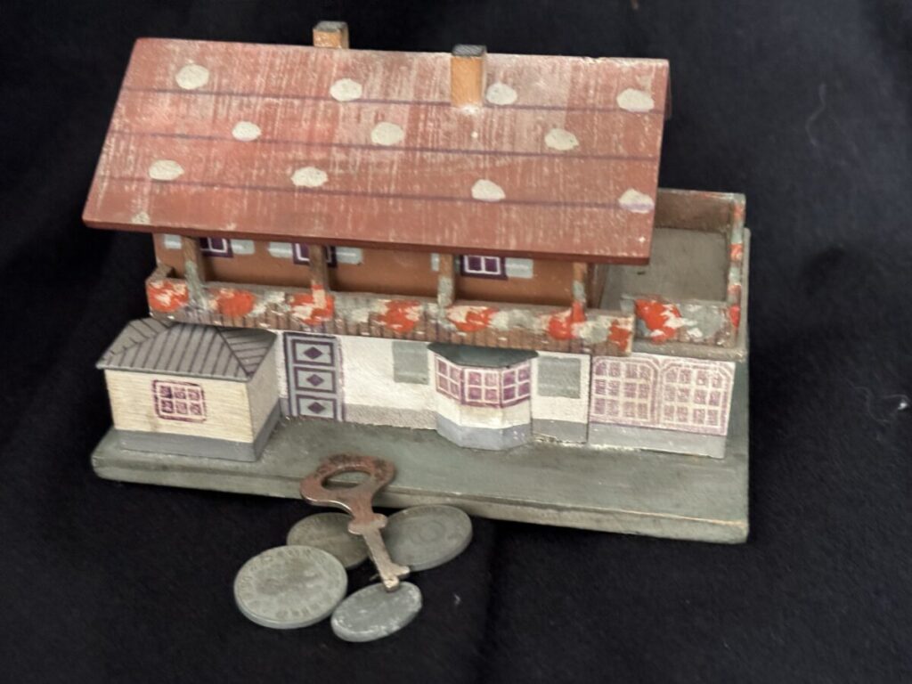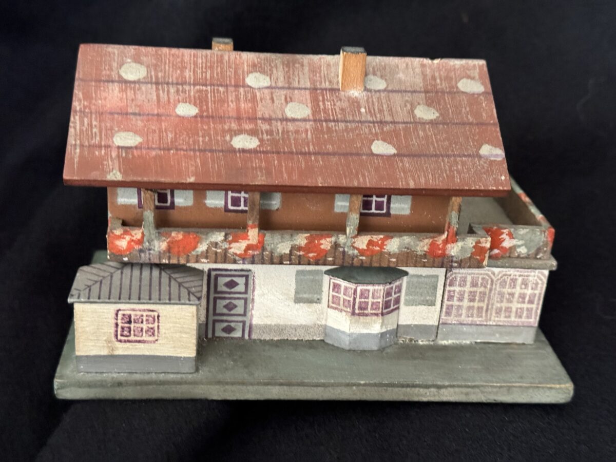 Souvenir “Haus Wachenfeld” savings box. Painted wood model of Hitler’s mountain retreat. Slot in roof for depositing coins. 13,5 x 11 cm.Very good condition, including key and Reichsmark coins.