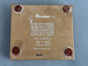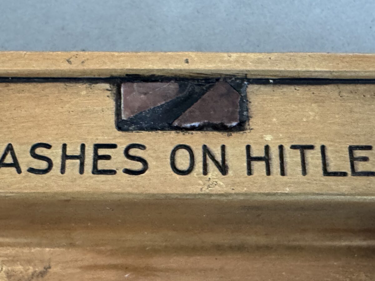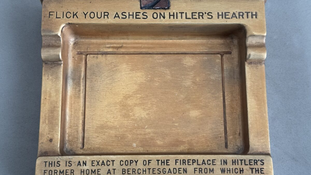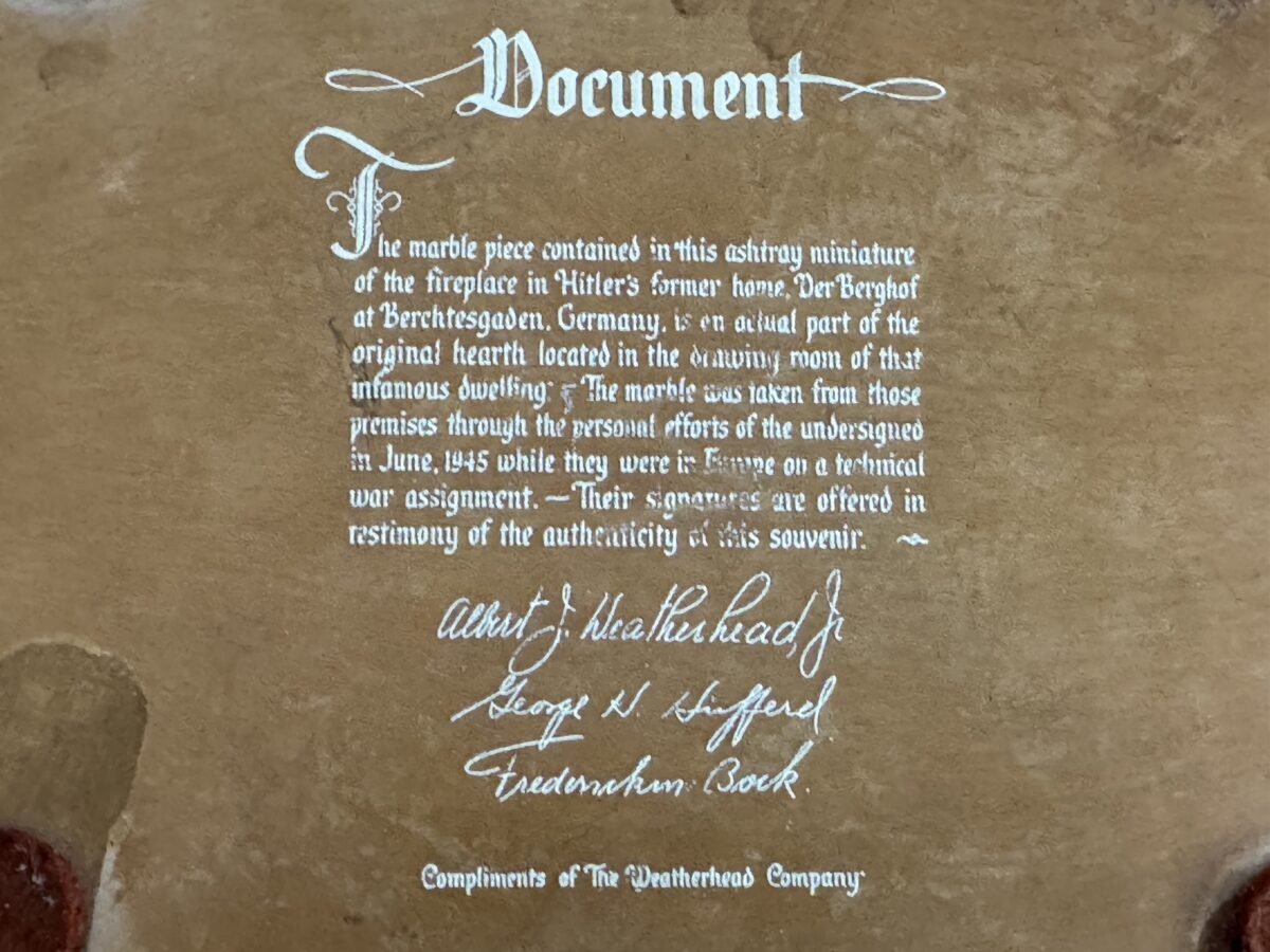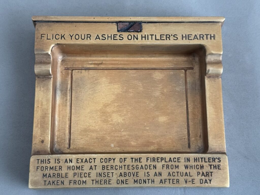 Hitler’s fireplace souvenir ashtray with marble inset for sale. Bronzed replica of Hitler’s fireplace at his Berghof residence near Berchtesgaden. The souvenir replica with a marble inset, which is an original section of the marble taken from Hitler’s original fireplace. The reverse bears a formal statement of authenticity, outlining that the original fireplace was removed from the Berhof by officers of the US Army in June 1945. (size: 16cm x 14cm).