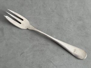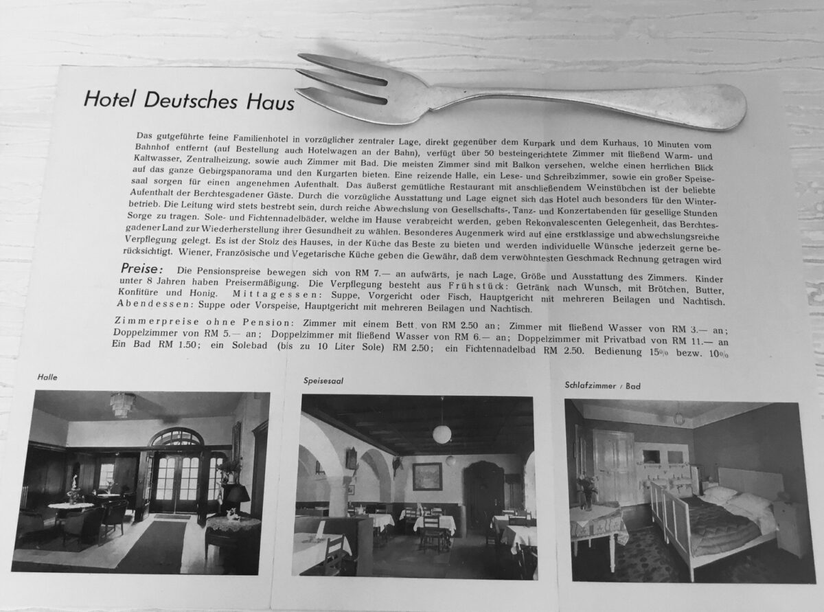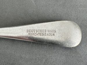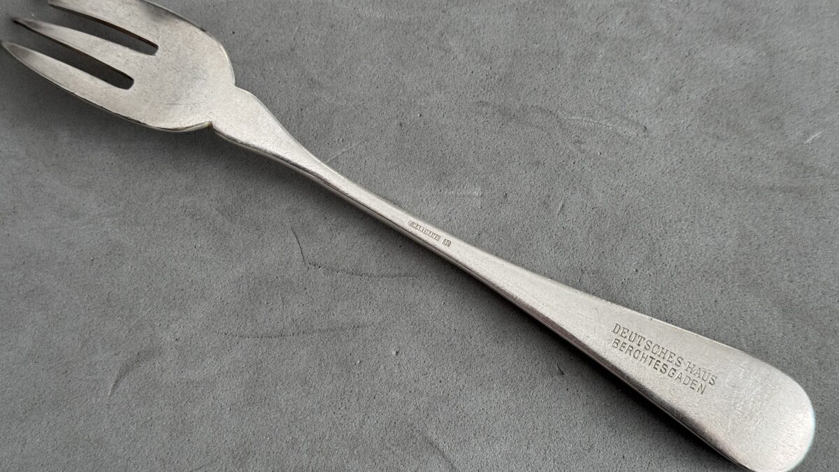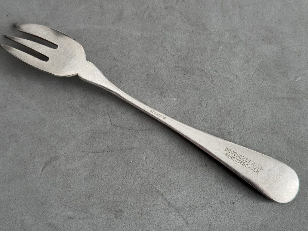 Rare fish fork from the Deutsches Haus Berchtesgaden measures 18,5.Adolf Hitler stayed in this hotel (with breaks) for two years. He wrote a part of the second part of Mein Kampf here. A lot of political friends came over and stayed at the hotel. At ground level the family Reiter had a clothes shop. Hitler saw the daughter Mimi Reiter once playing with a dog in the Kurparks nearby. He talked with her in the park. A short affair followed. She died in 1992 (lonely and as an alcoholic) with the idea that she was the most important love Hitler ever had.
